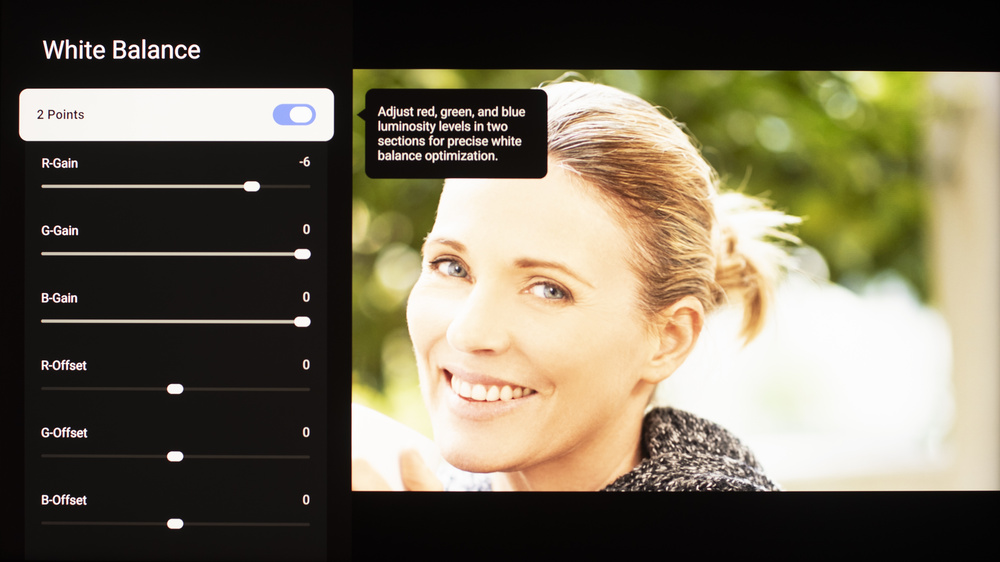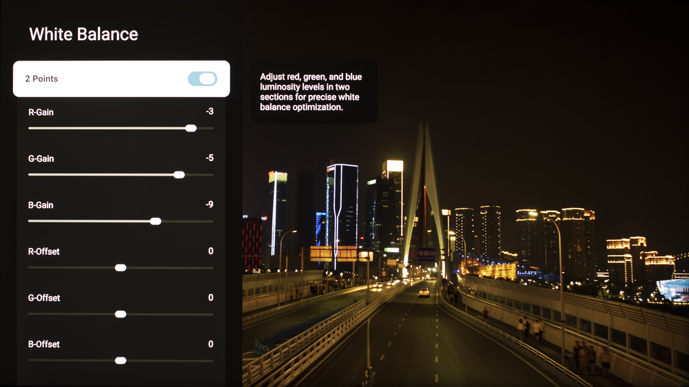The following are the old results of calibrating the white balance of our unit to 6500K in HDR using the 2-point method. We don't publish the values we used for our new 20-point calibration, as it varies significantly between individual units, so our values wouldn't be valid.