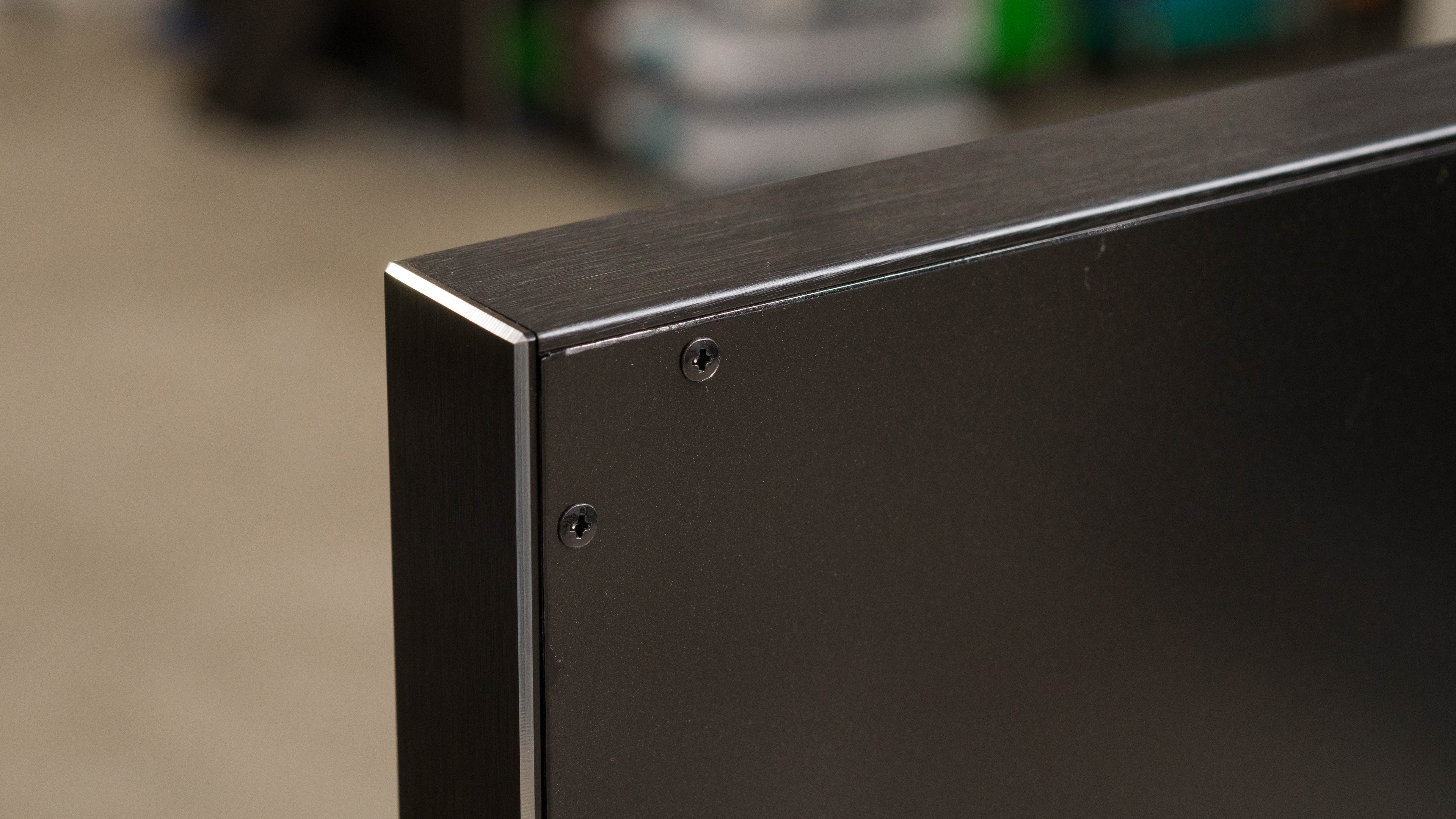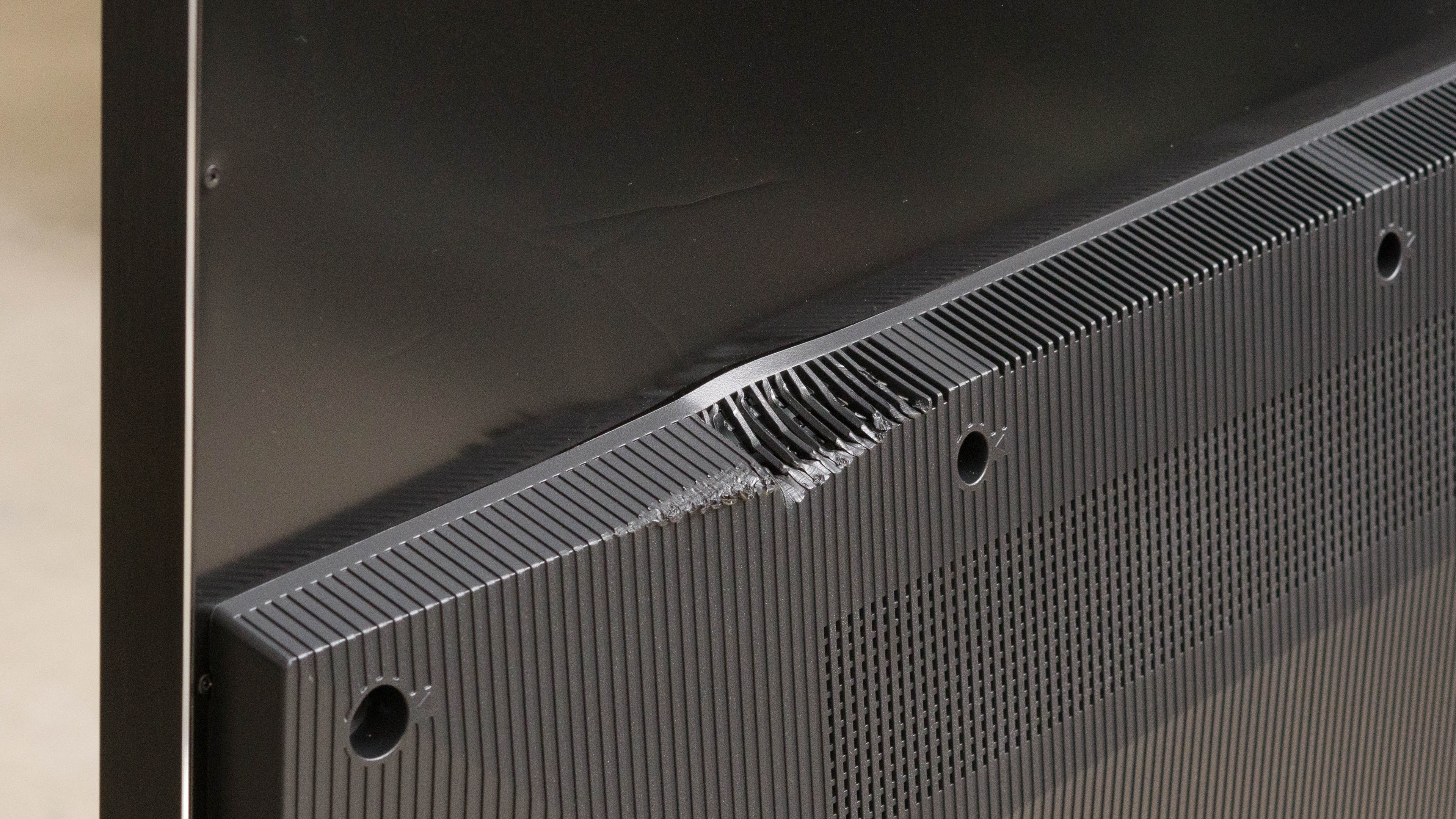 The TCL 85R745 has decent build quality. The metal stand holds the TV very well, and there's minimal wobble, which is great considering its size. The edges are metal but the rest of the TV is plastic. There's minimal flex on the back, but the plastic at the bottom feels cheap. Our unit came damaged on the back, and it shows how cheap the plastic is on the back, so we considered it for the overall build quality.