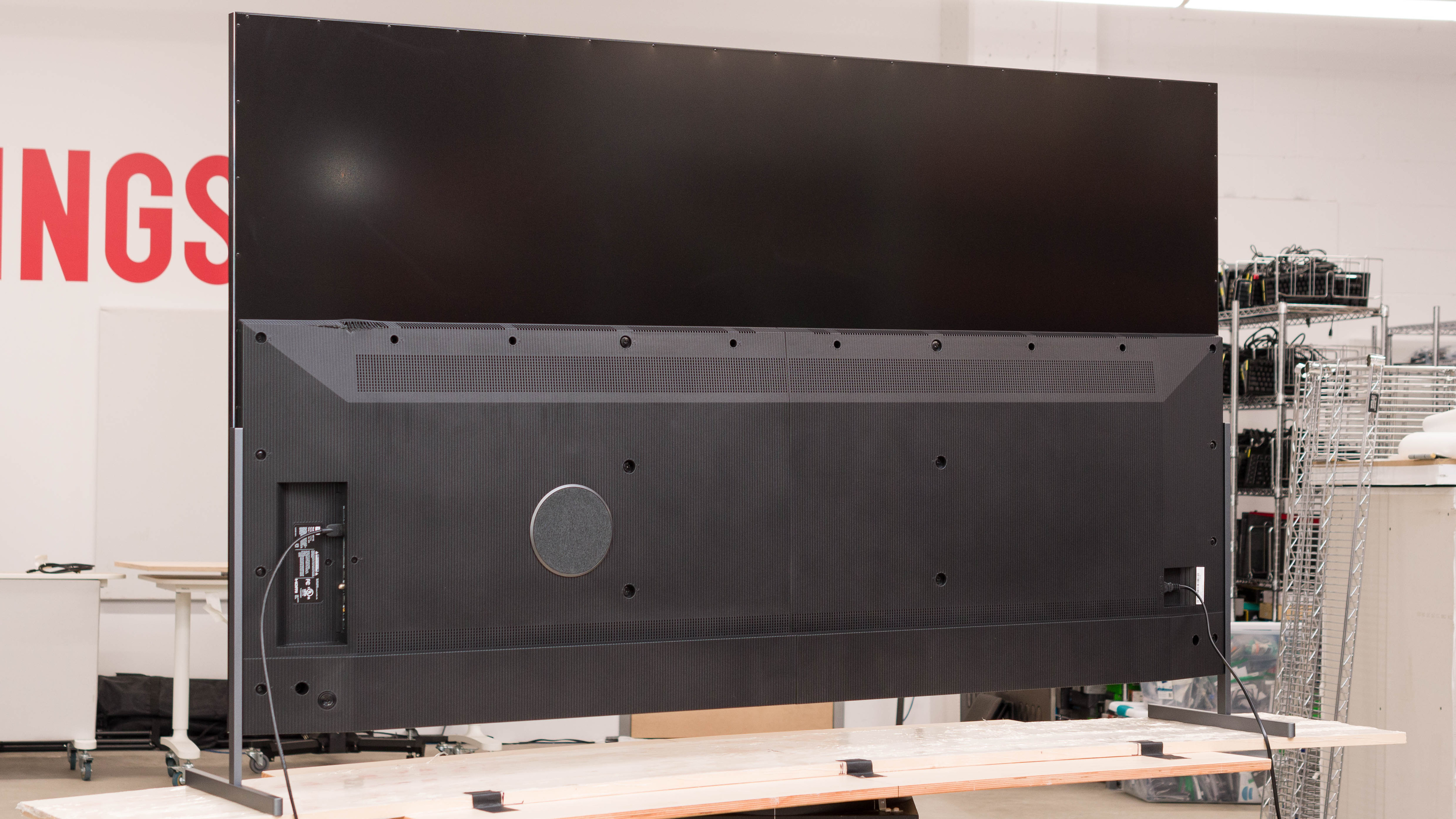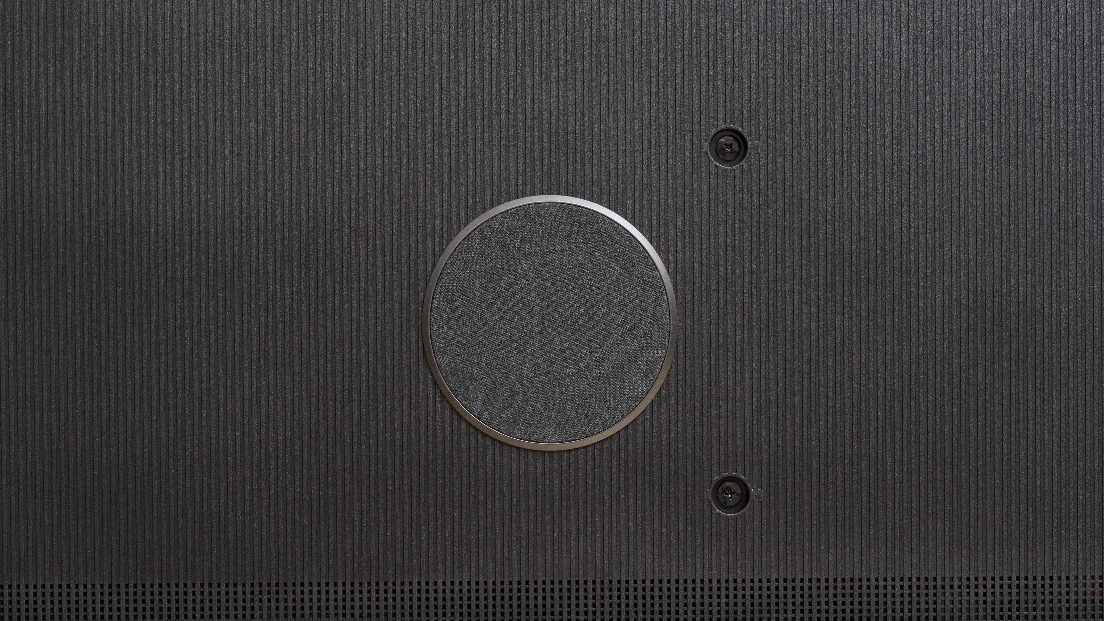 The back of the TCL 85R745 is a mix of glossy plastic on top and cheap-feeling matte plastic at the bottom. The circle on the left side of the VESA mount is the subwoofer. Unfortunately, there's no cable management.