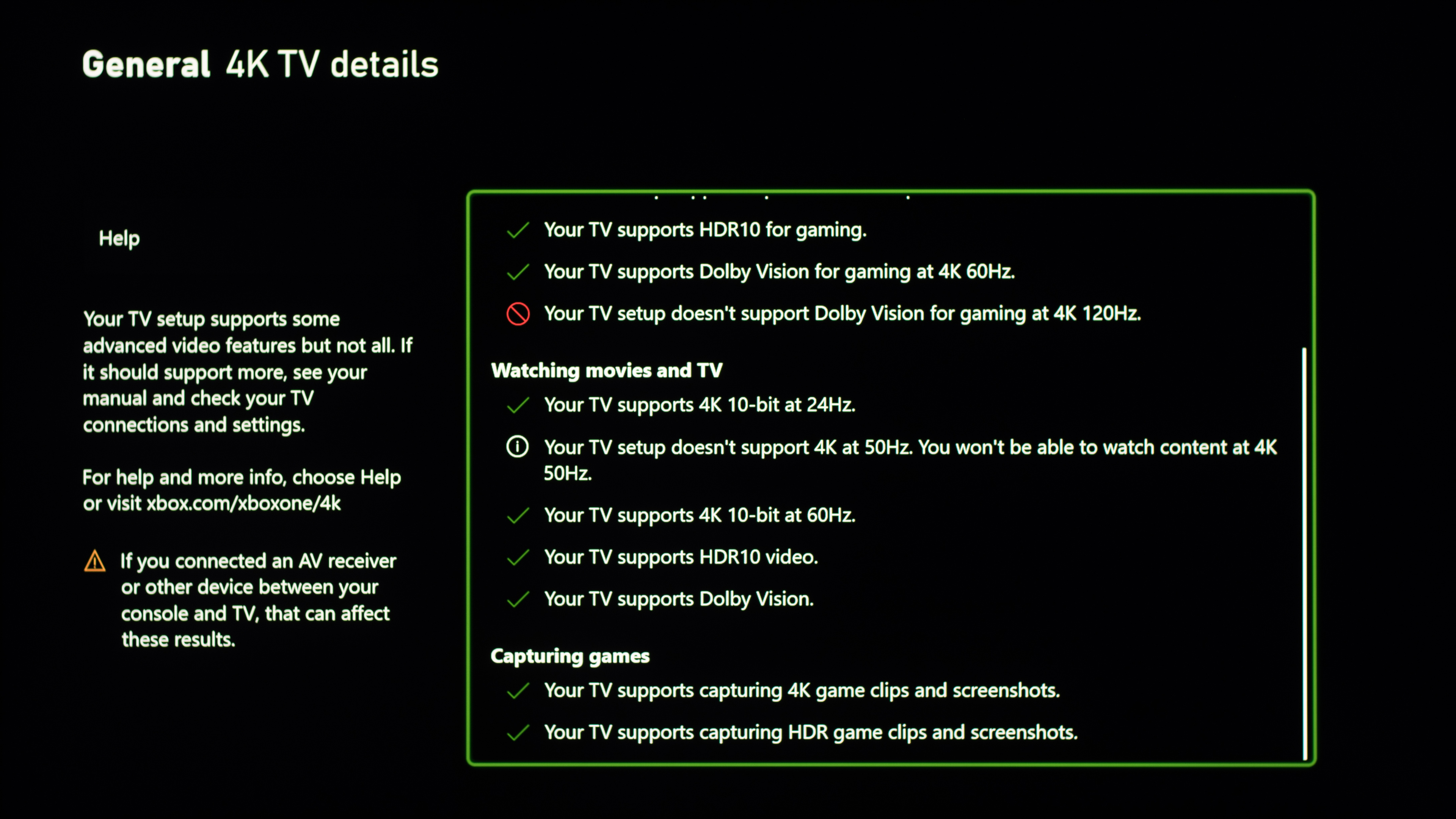 The TCL 85R745 displays any signal from the PS5 and Xbox Series X at 4k @ 60Hz or below. It has an Auto Low Latency Mode that automatically switches the TV into Game Mode when you launch a game from a compatible device, and there aren't any settings for it. You can also see that the TV supports both HDR10 and Dolby Vision from the Xbox here.