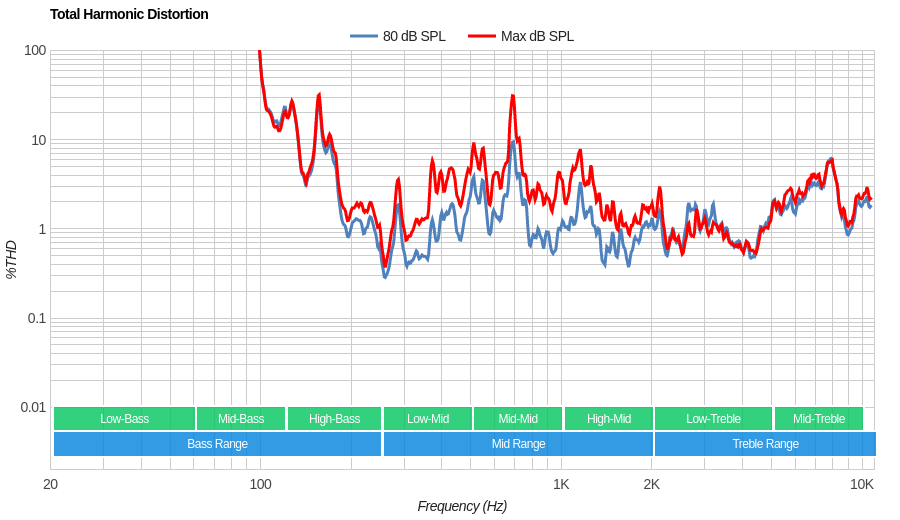 The distortion performance of the Vizio M65-F0 is decent. The overall amount of THD produced is within decent limits at 80dB SPL, and there is not a big jump in THD at maximum volume either. However, this TV doesn't get very loud.