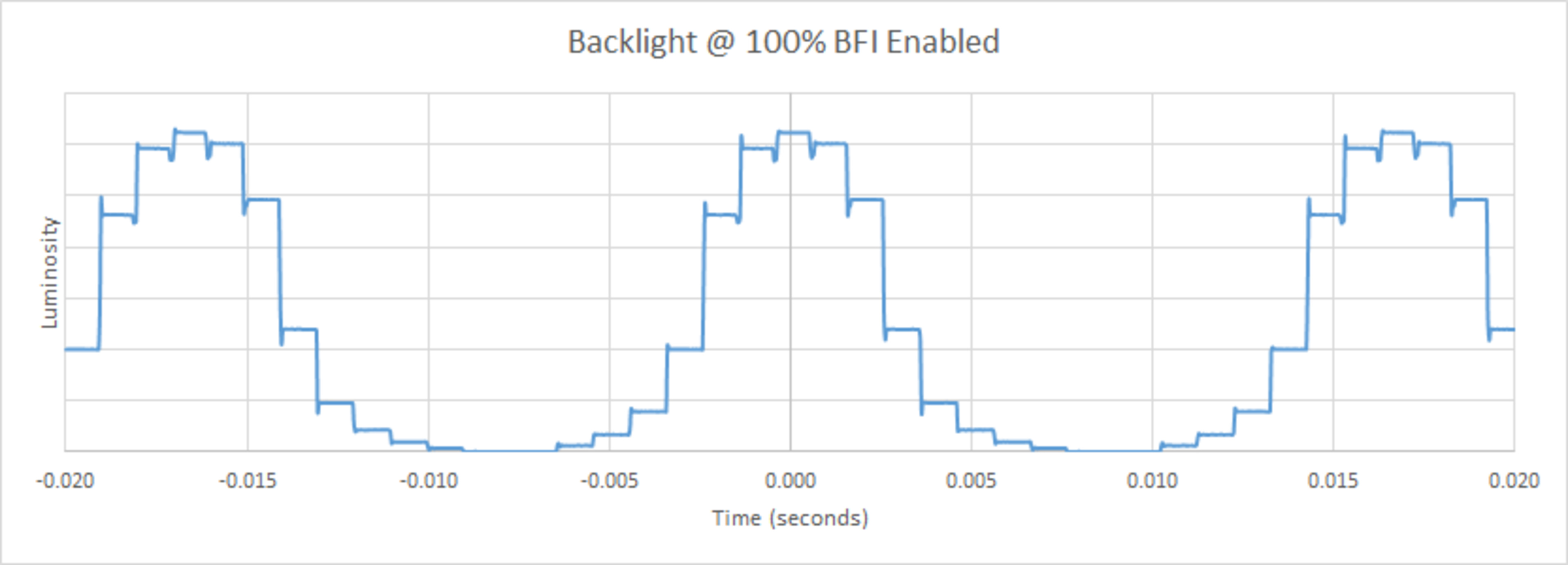 The M657 has an optional black frame insertion (BFI) feature to help improve the appearance of motion. It can lower its flicker frequency to 60Hz, which makes motion appear crisper but at the same time, there are more noticeable duplications in motion. The setting that controls BFI is called Clear Action.