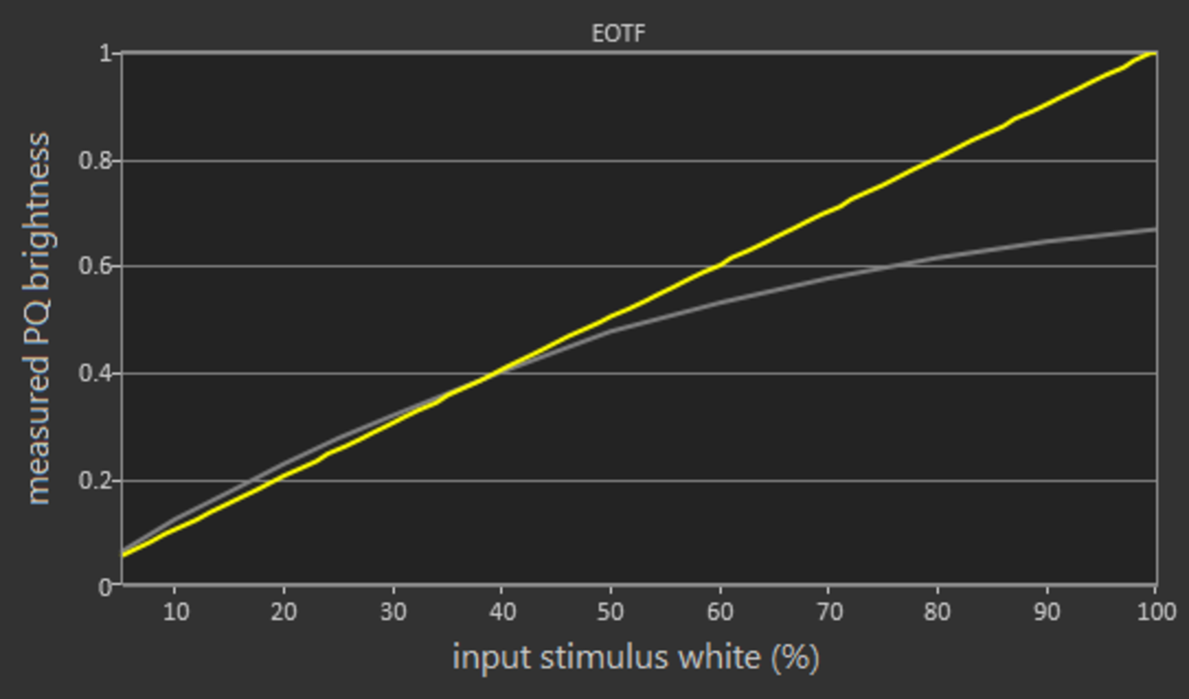 The Vizio M7 Series Quantum 2019 has an excellent color gamut, among the widest we've ever measured. Unfortunately, the EOTF (Electro-Optical Transfer Function) doesn't follow the PQ curve closely. Although darker scenes are displayed fairly accurate (just slightly brighter), the roll-off towards the TV's highest brightness starts too early and all scenes above around 100 cd/m² appear darker than they should be. The 'Game' mode EOTF is rather similar in behavior as shown here, but the darker scenes are slightly brighter as the backlight defaults to '100'.
