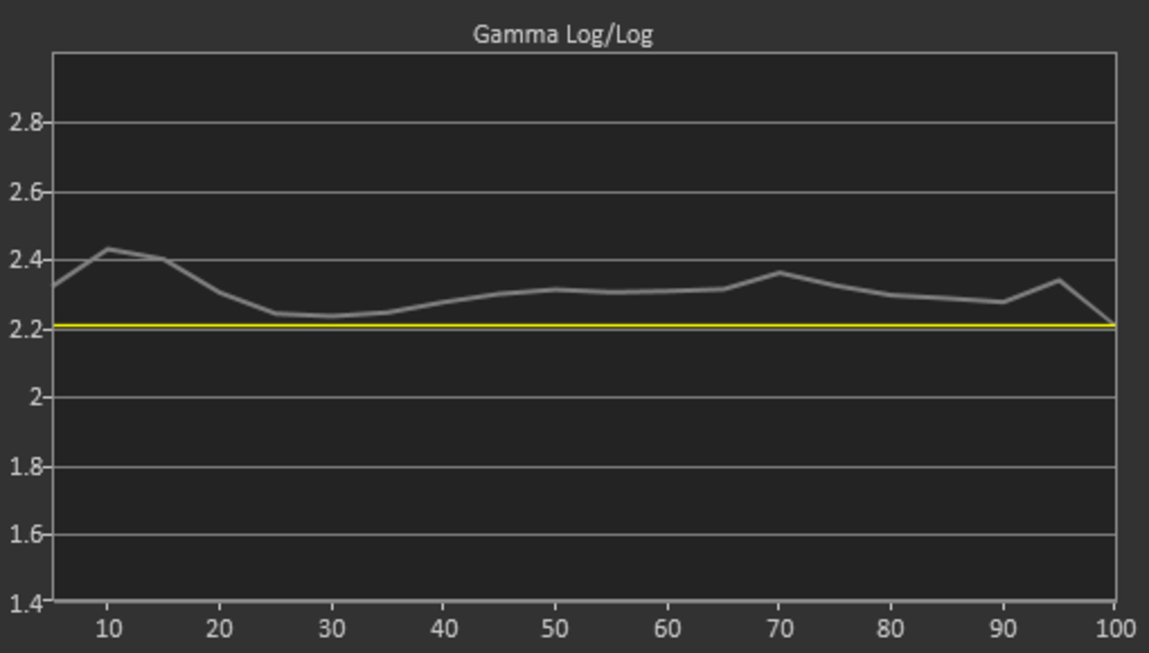 Excellent accuracy for the M657-G0 after calibration. We changed the Gamma setting to 2.1 and now Gamma follows the target very closely except for the very dark scenes that are still crushed. Any remaining inaccuracies in the colors and the grays are unnoticeable and the color temperature is very close to the 6500 K target.