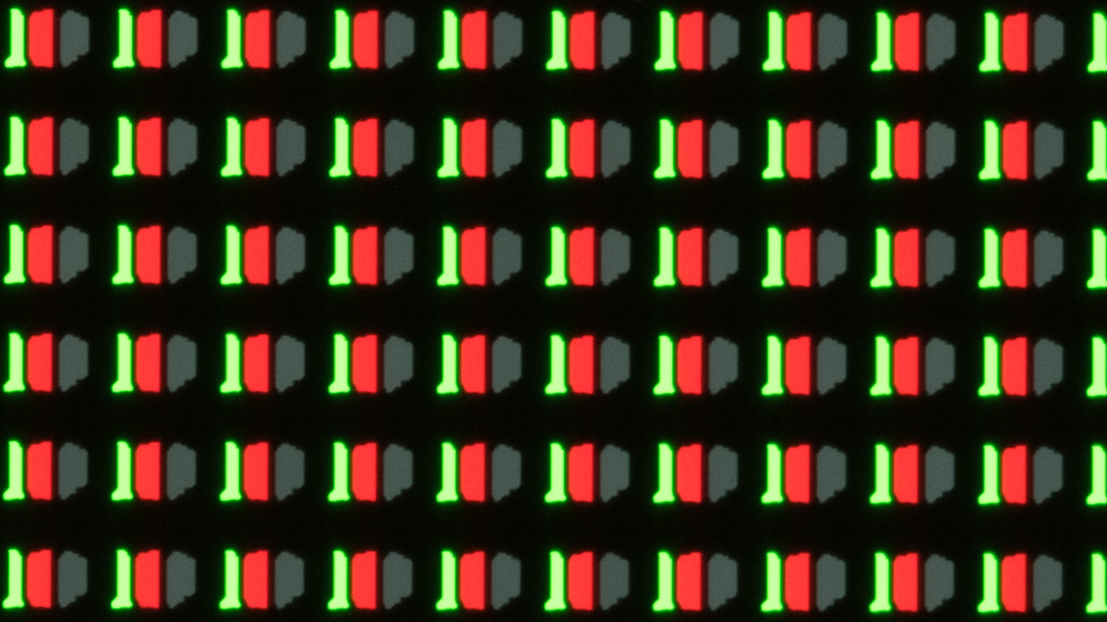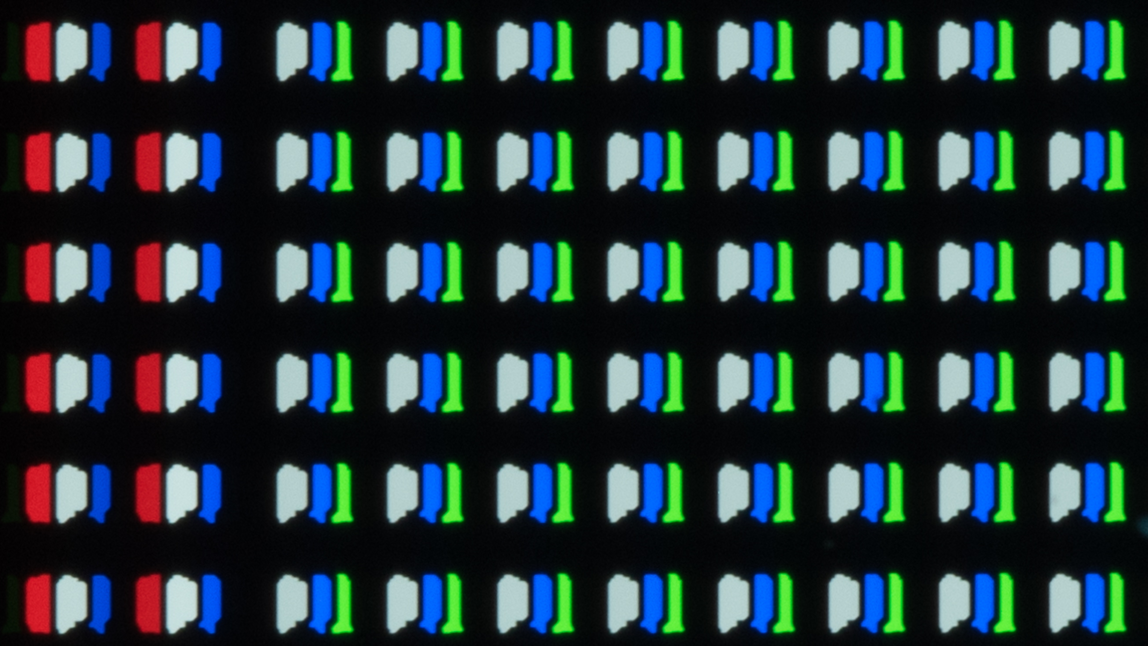 This TV has an RGBW pixel structure, but all four pixels are never used at the same time. The image above shows the white and blue subpixels, but the blue is considerably darker than the white pixel. You can see the red and green pixels in these pictures: Photo 1 and Photo 2. The way the red and blue pixels are darker than the white pixels is similar to the LG BX OLED.