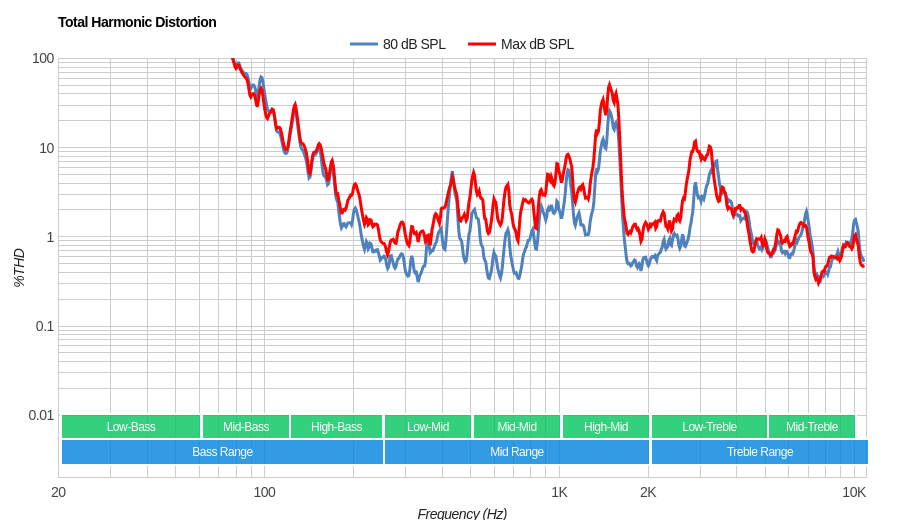 The distortion performance is about average. The overall amount of THD produced is elevated, especially between 1KHz and 2KHz, which could make the sound of that region a bit harsh. On the upside, there is not a big jump in THD at maximum volumes.