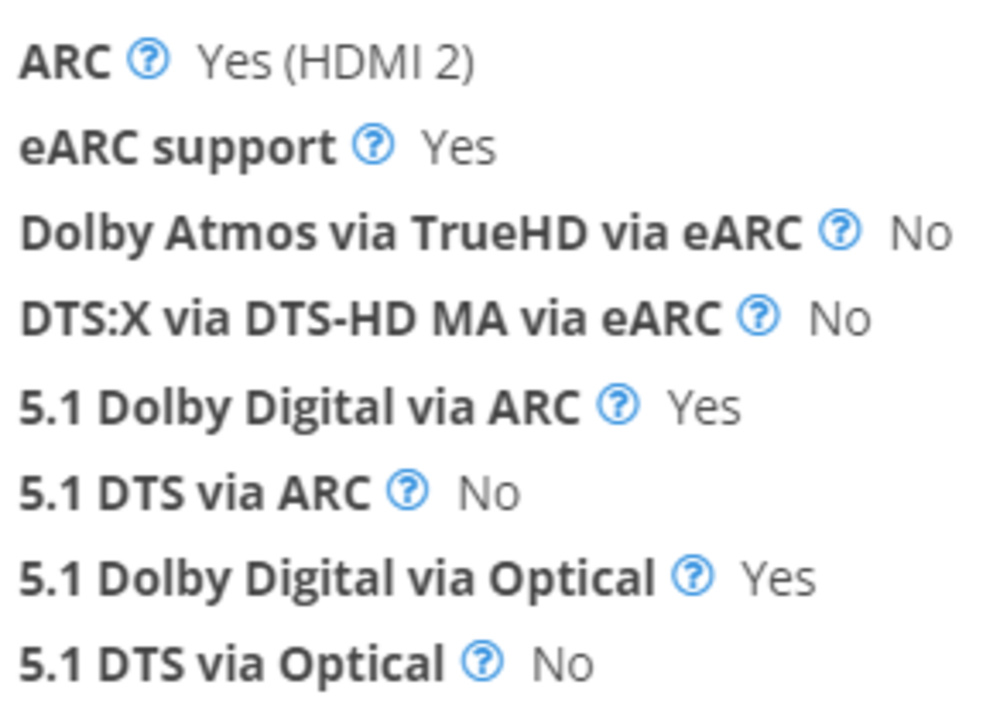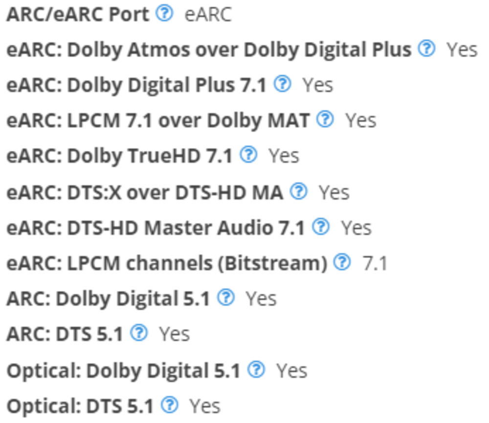 Finally, we removed the port that used to be listed next to the Yes/No on the ARC test. This information is already provided in our inputs section, where most users would expect to find it, and where it's the most useful. Knowing which port is the ARC/eARC port is mainly helpful for knowing if it'll interfere with your planned connection scheme. If you only have two ports that support HDMI 2.1 bandwidth, and one of those is also the eARC port, then you can't take full advantage of an Xbox Series S|X and a PS5 simultaneously. Providing this information in the audio passthrough section didn't make sense, as it's useless to users without knowing which ports are the high-bandwidth ones.