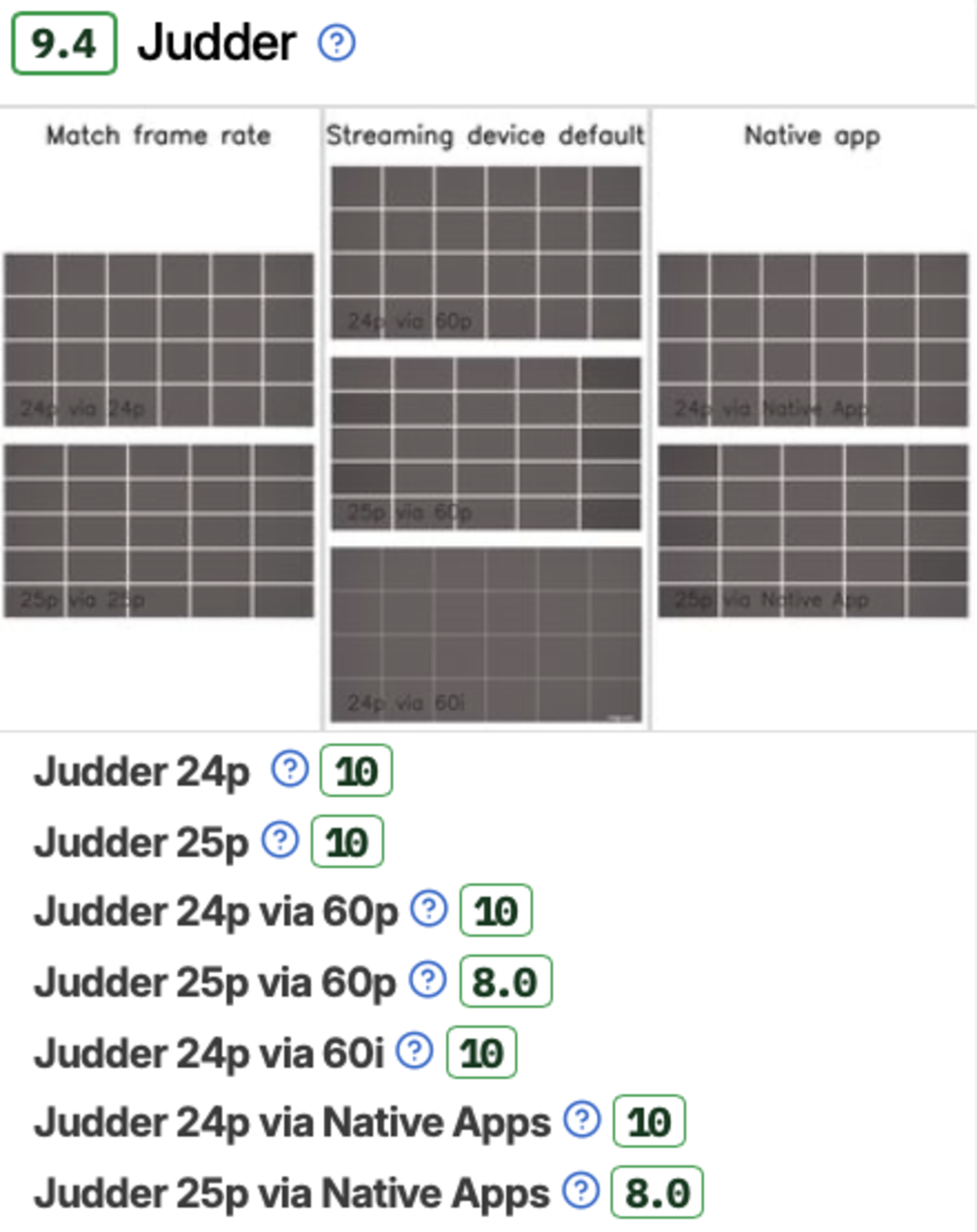 - 24p Tests: Micro Judder-Free 24p, Micro Judder-Free 24p via 60p, Micro Judder-Free 24p via Native Apps.