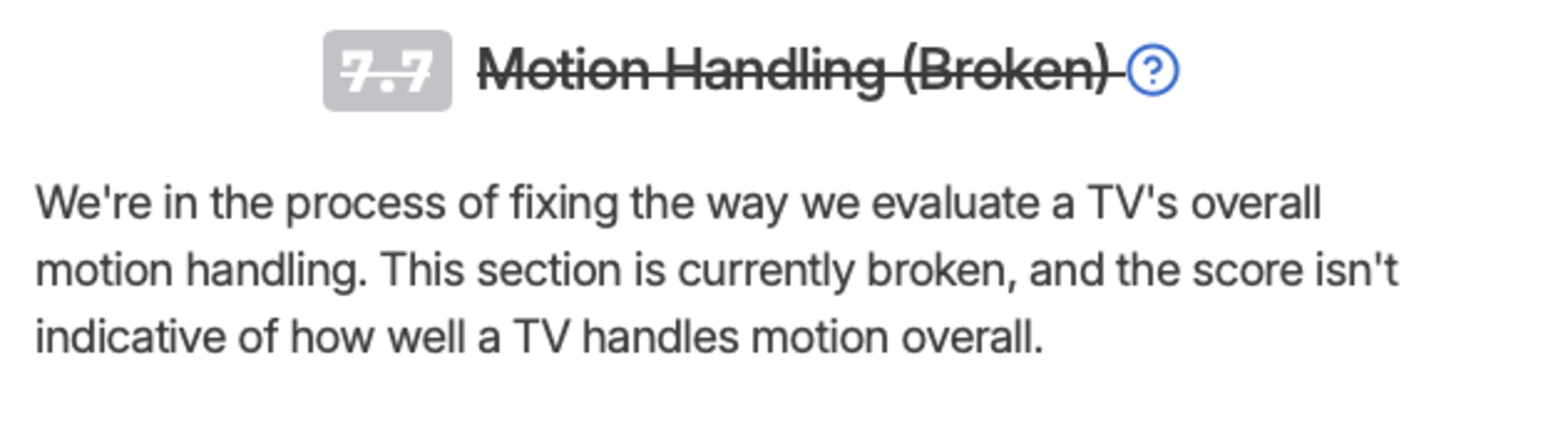 We've added the micro-judder test to our 'Motion Handling' usage and adjusted the weight of some other motion-related scores. We feel like our new micro-judder test and the updates to our judder test are moving us in the right direction of figuring out how well a TV handles cinematic motion. However, we don't feel like we're quite there yet, and we still plan to release two more test bench updates that focus solely on motion handling with low frame rate content. For this reason, we've kept our 'Motion Handling' usage category in the 'Broken' state, since these changes aren't enough for us to give a confident score for overall motion handling.