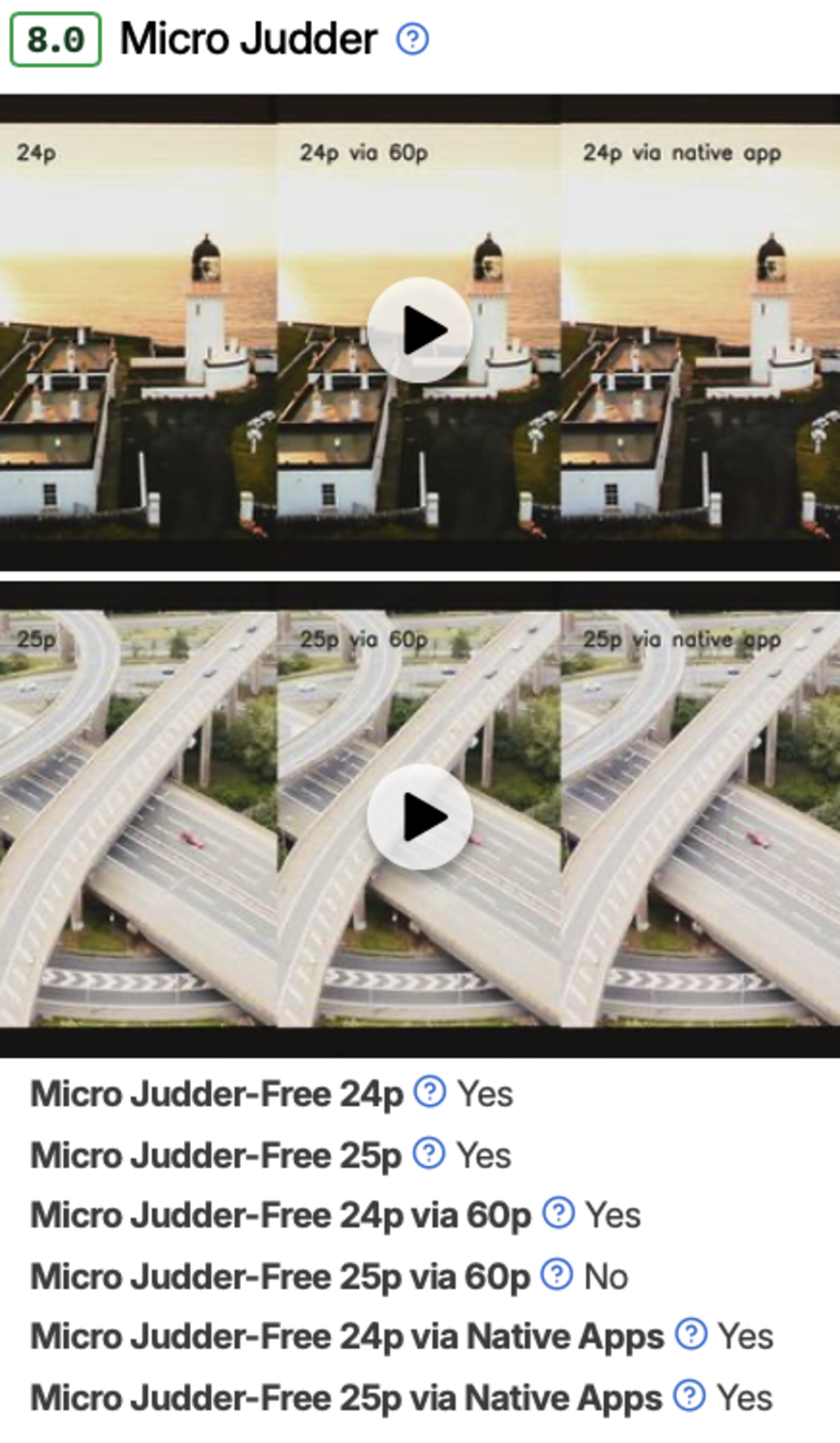 - 25p Tests: Micro Judder-Free 25p, Micro Judder-Free 25p via 60p, Micro Judder-Free 25p via Native Apps.