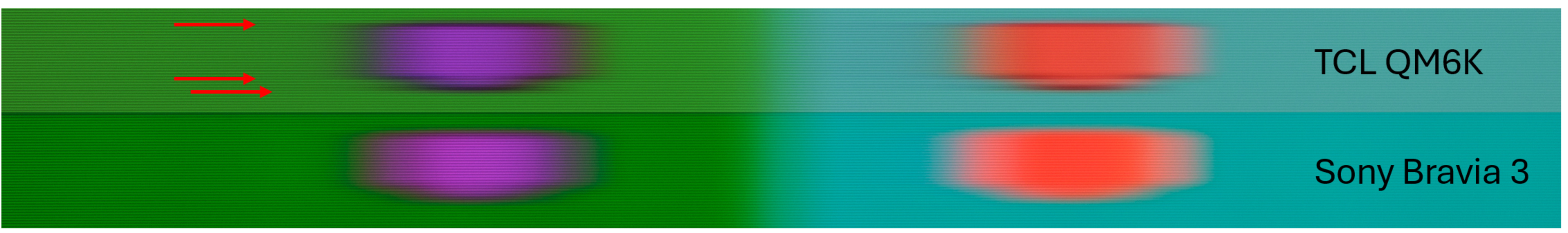 Below is a comparison of the TCL QM6K and the Sony BRAVIA 3. The TCL shows clear signs of edge artifacts, since there's obvious trails behind the edge of transitions that are caused by overshoot. On the other hand, the Sony has none at all, so transitions on that TV are clearer. The red arrows in the image below point to the blurry trails that you can see when watching real content on the TCL.