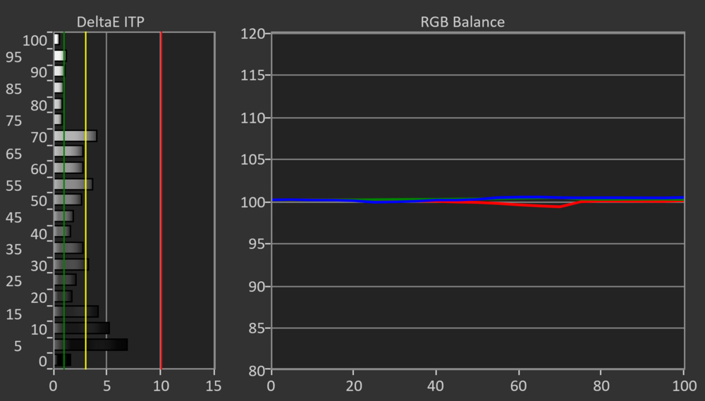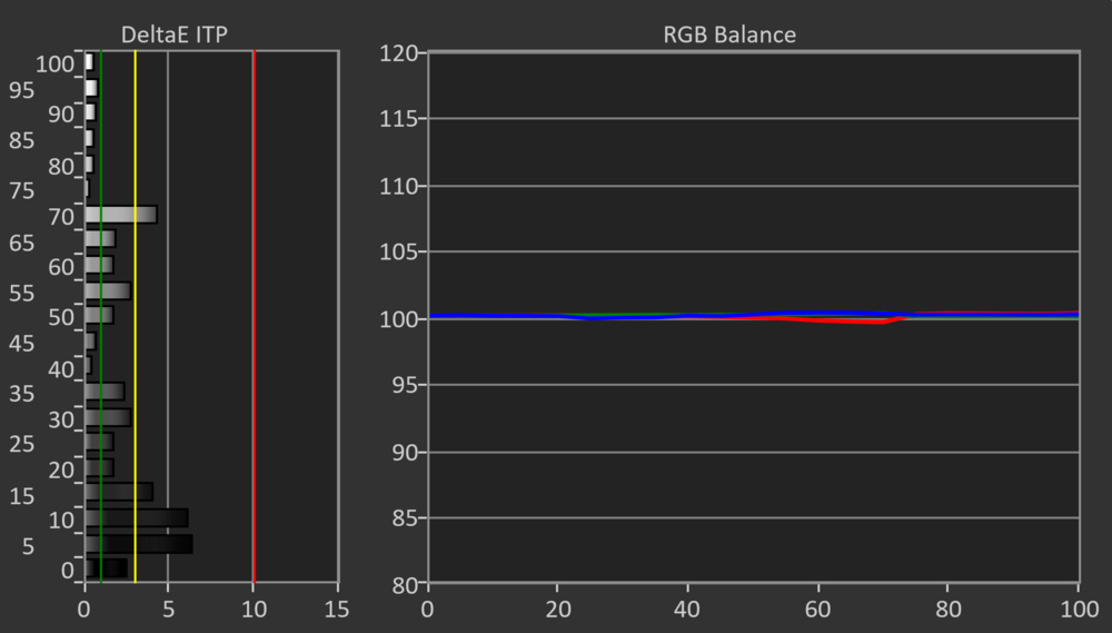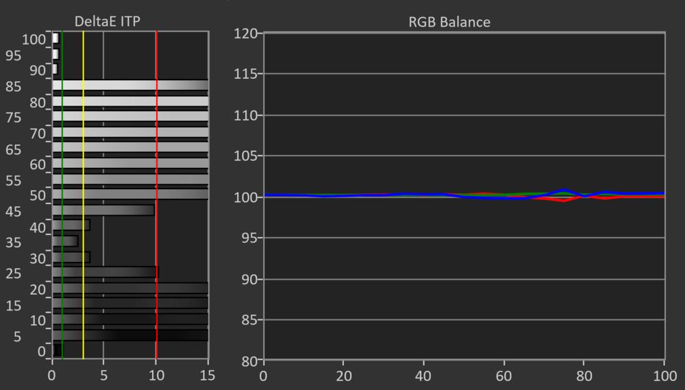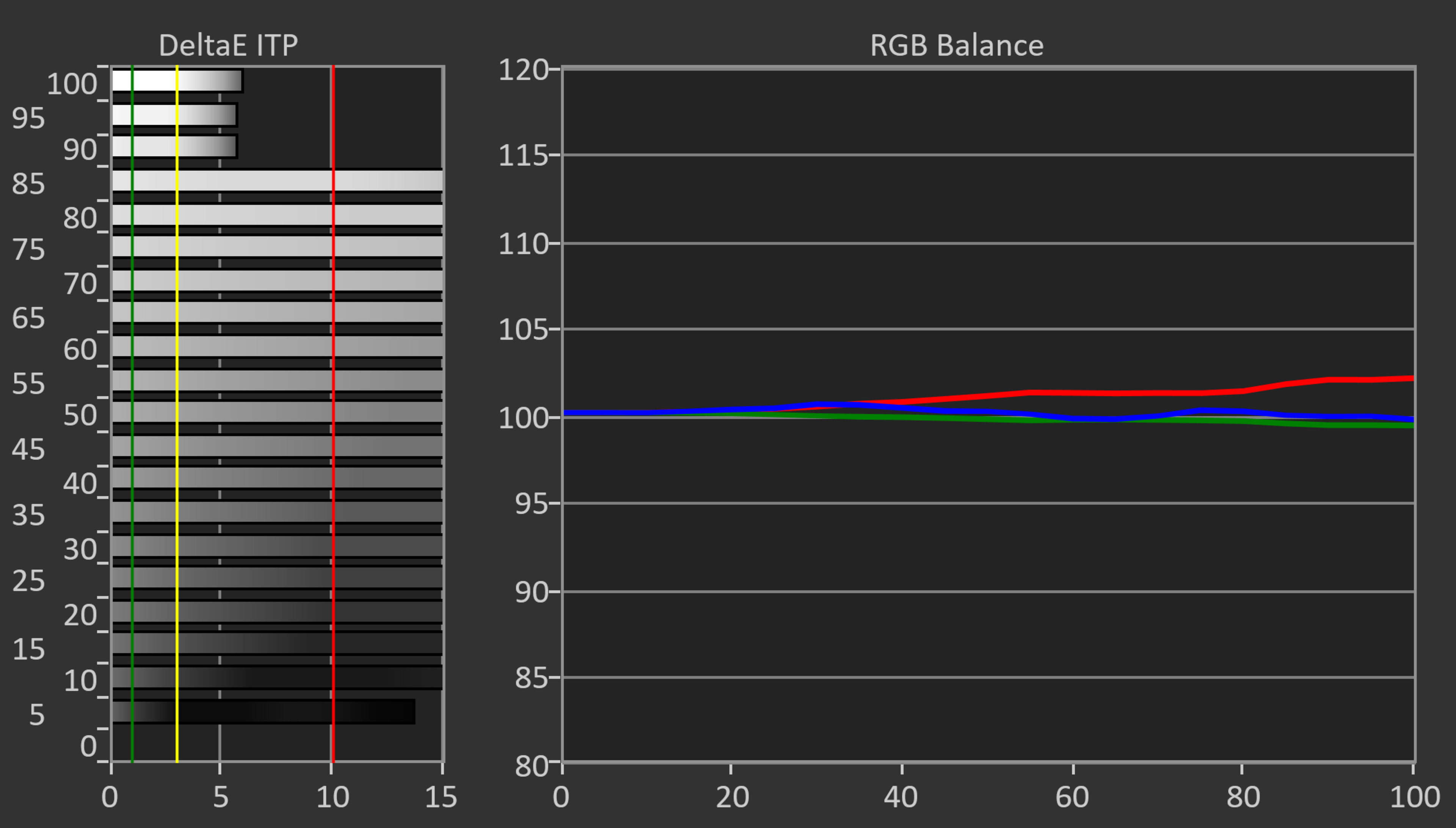 By looking at the two examples above, you can see that the TCL QM8/QM851G QLED has too much red throughout its shades of gray. You can also see exactly which shades are most affected by inaccuracies by looking at the length of the bars on the left side of the graph. In the case of the TCL, you can see that shades ranging from 5%-85% have significant inaccuracies. On the other hand is the Panasonic Z85A OLED. Although it still has some minor inaccuracies in some shades, the bars are significantly shorter and don't come close to the red vertical line, so most people won't notice its minor inaccuracies. You can also see on the right side of the graph that blues are slightly over the horizontal target line and reds are slightly below it in some areas, but since the red, blue, and green lines are very close to the target, you can easily determine that the TV has outstanding white balance.