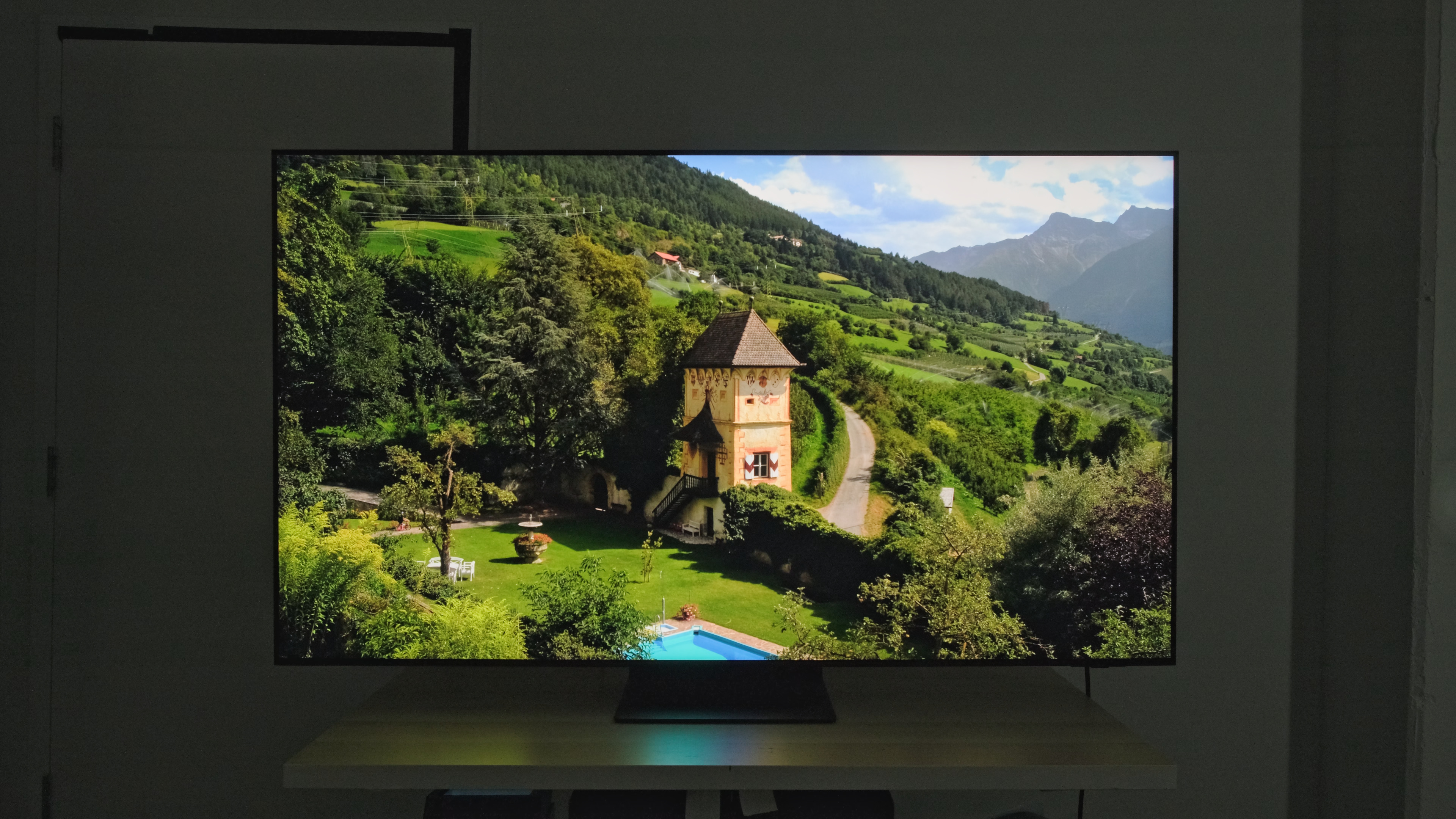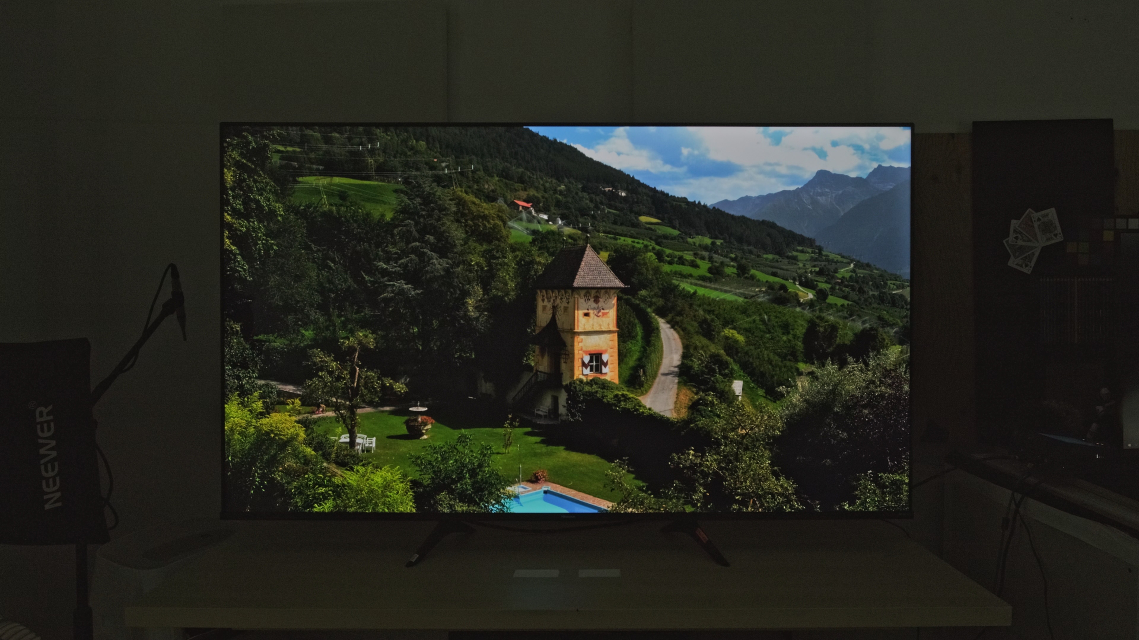 For the landscape real scene test, we measure the peak brightness of a small triangle on the pool along the bottom edge. On an ideal TV, this should measure around 300 cd/m².