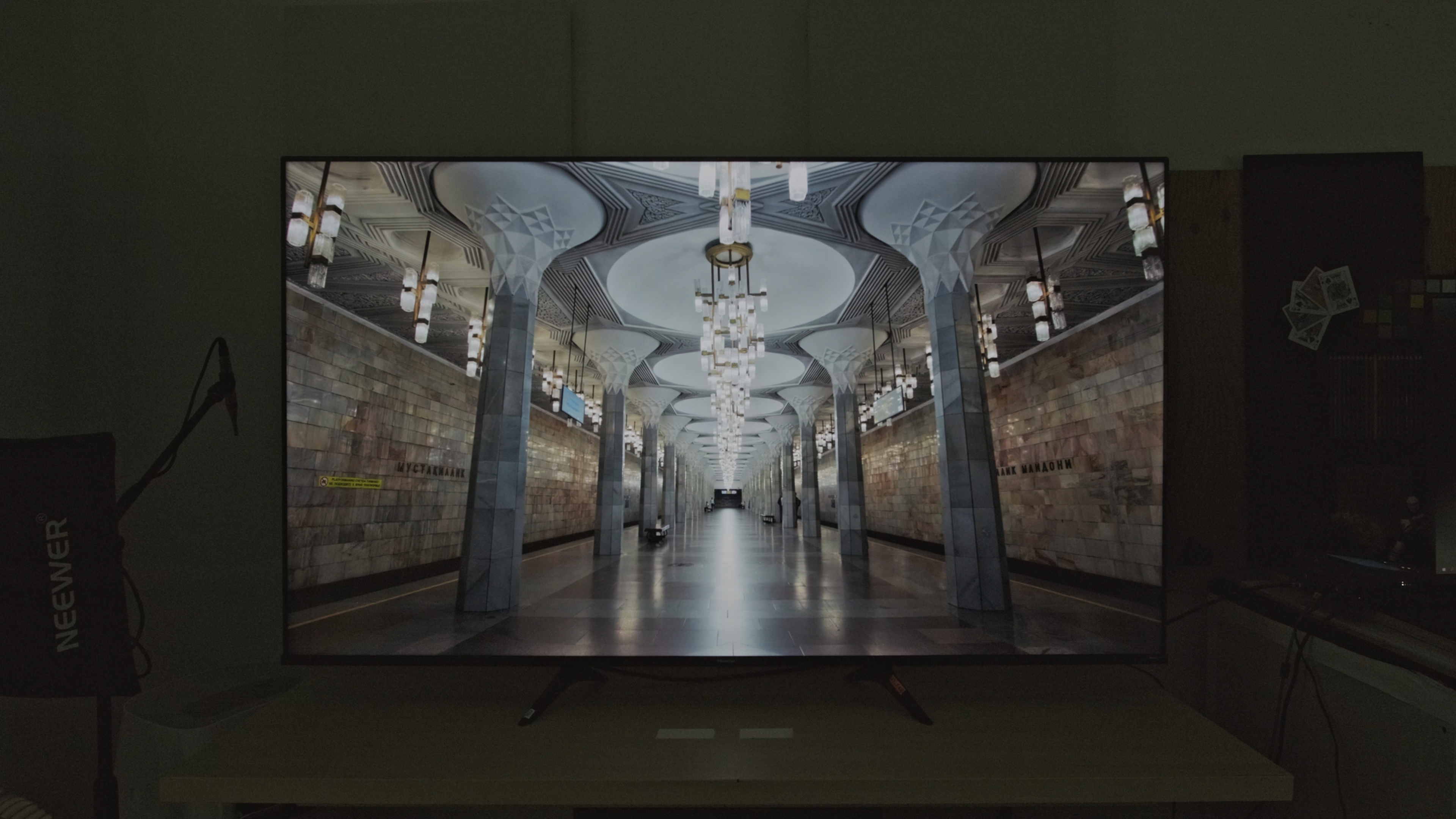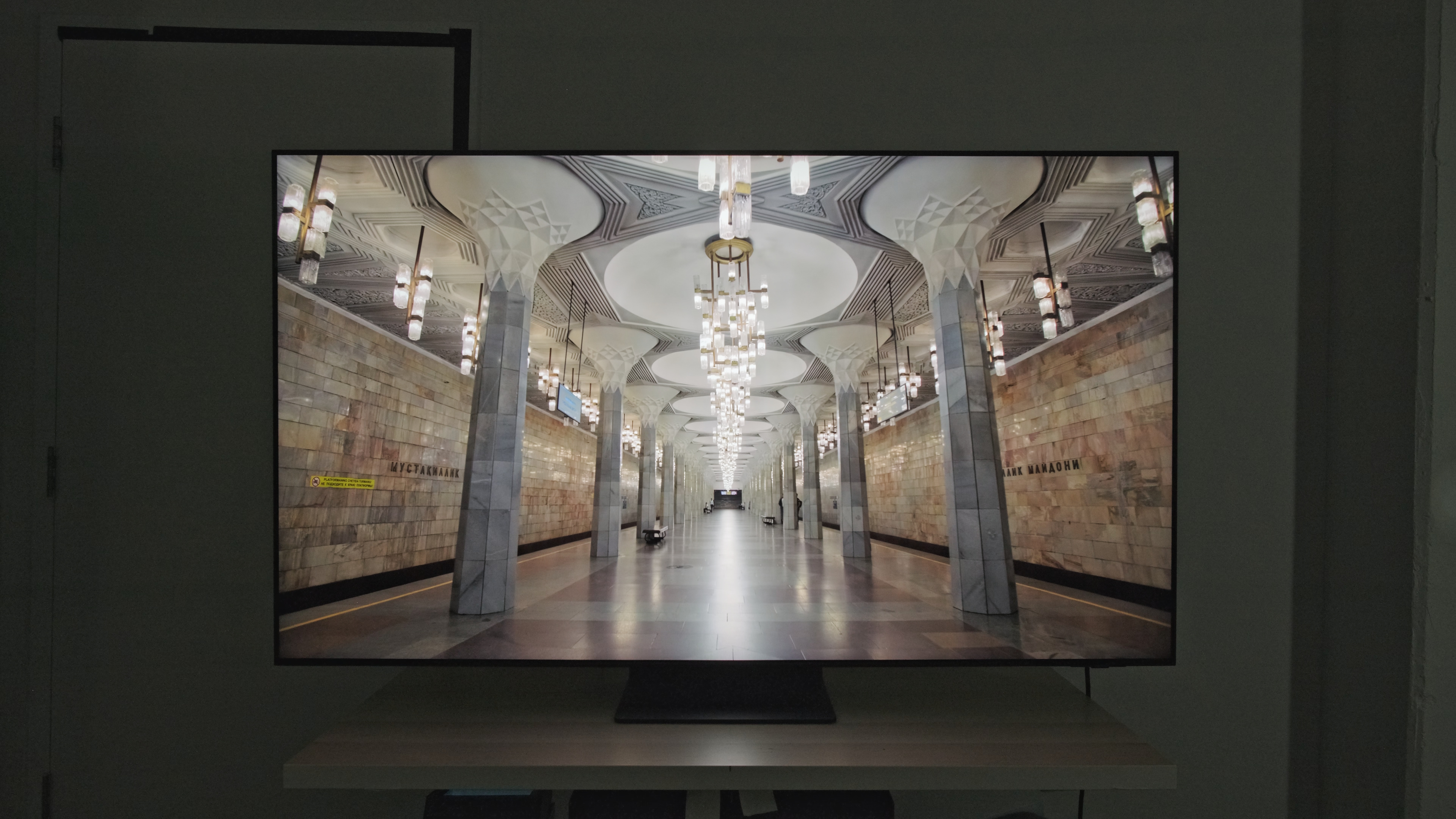 For our first real scene test, we display a bright hallway shot. We measure the peak brightness of the two overhead lights and record the higher value. These small highlights are designed to be very bright, so they should measure around 1,950 cd/m² on an ideal TV. Beyond these highlights, the entire scene should also appear bright, like it is on the Samsung QN90D QLED below.