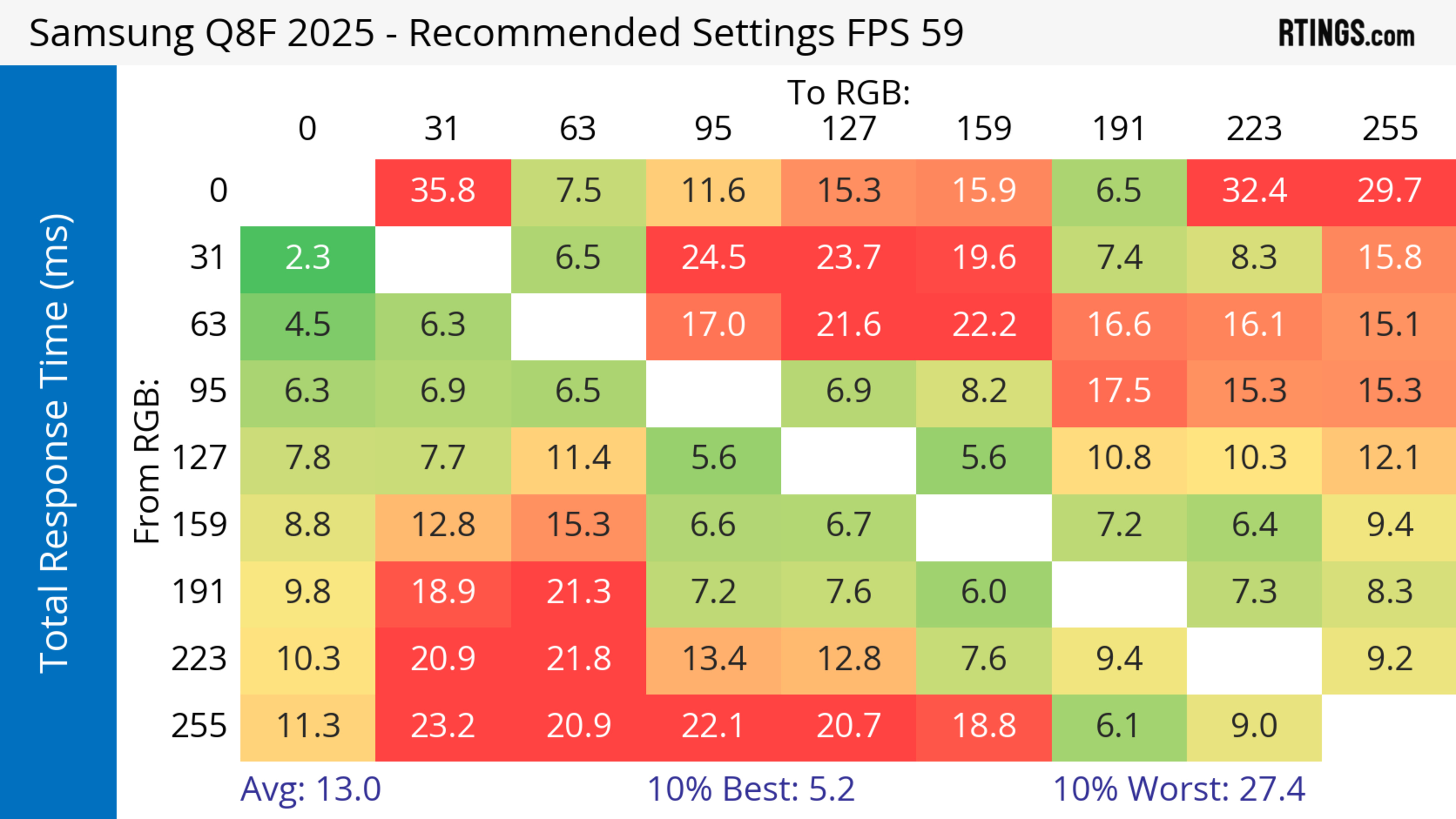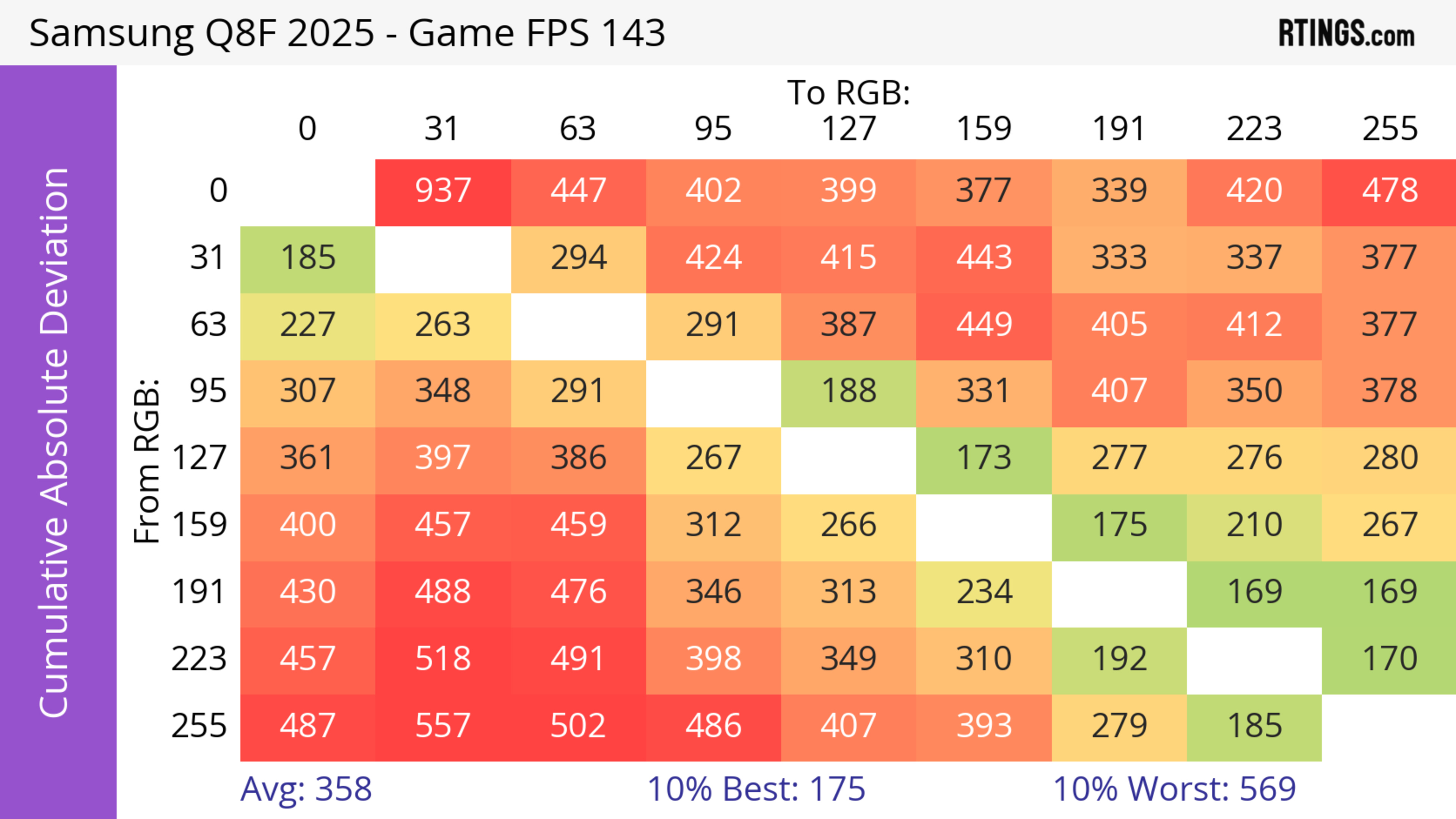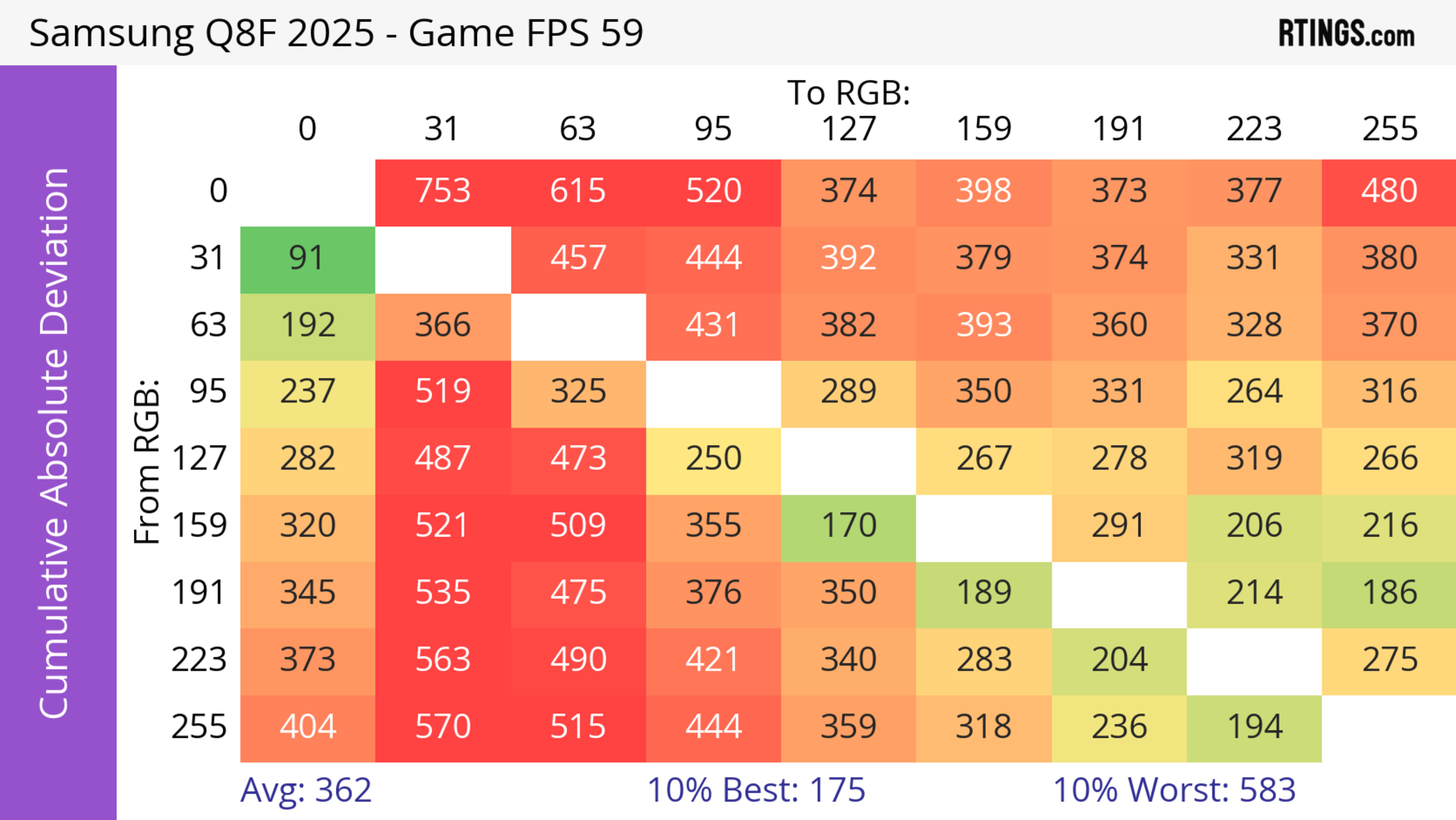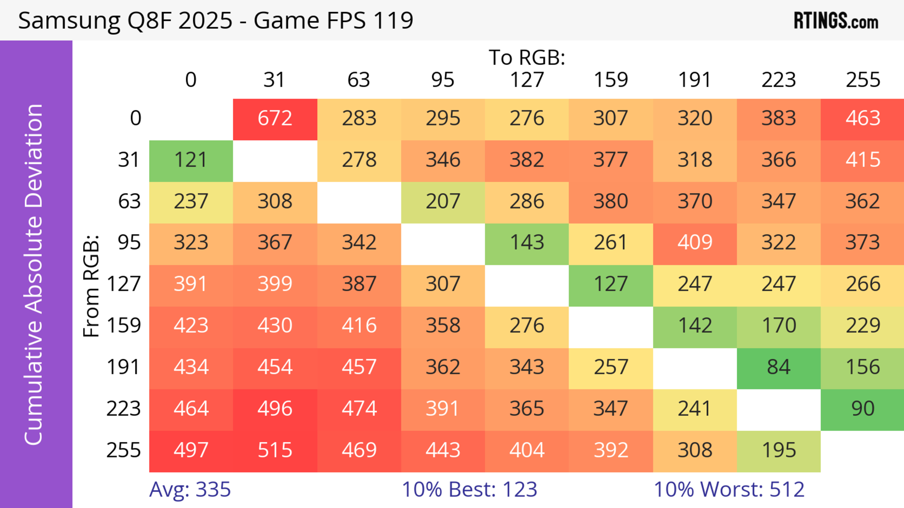 The Samsung Q8F 2025 is marginally better than the Samsung U8000F. The Q8F gets a bit brighter in both HDR and SDR, so it can handle glare a bit better during the day, and bright scenes in HDR are slightly more vivid. The Q8F also has slightly better color reproduction, as it can display a slightly wider range of colors.