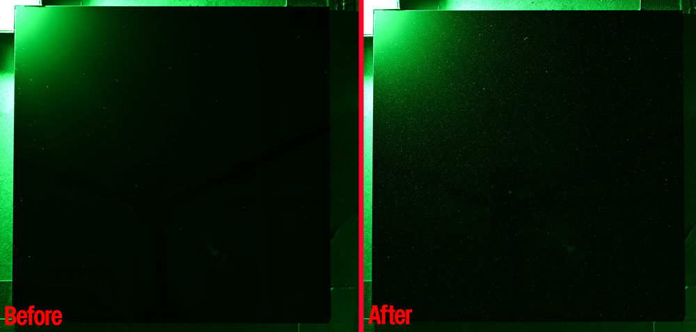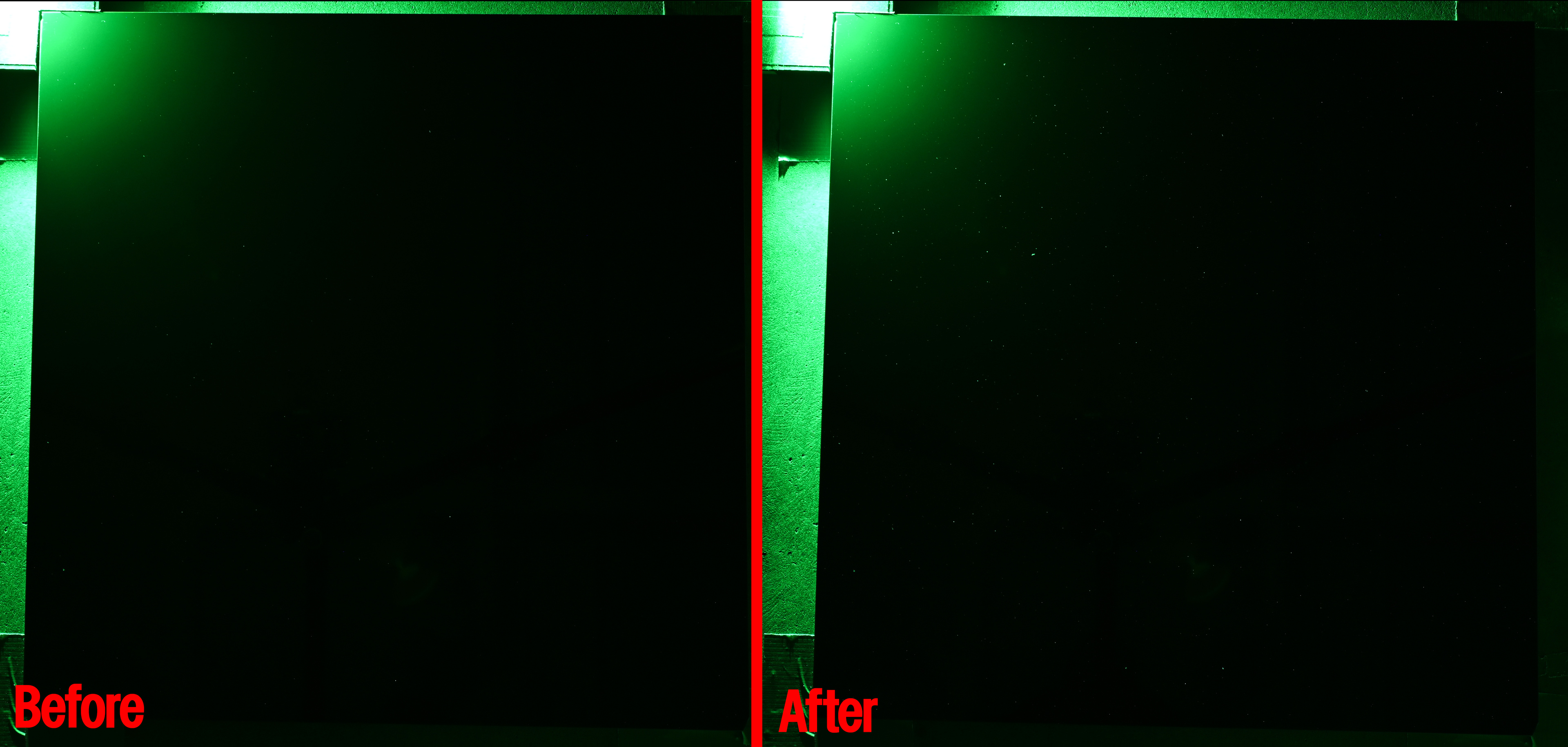 To illustrate this, we laid a clean, black tile on the floor, about 1.5 meters away from the trash can, and emptied the Dyson V15. You can see the same tile before and after emptying in the comparison photo below.