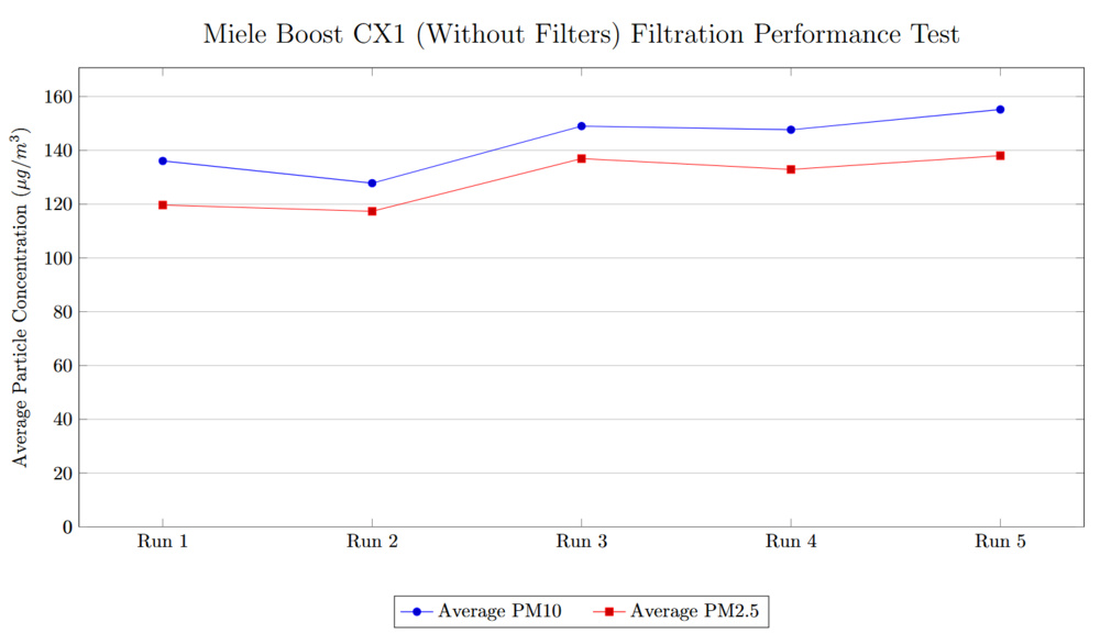 Repeating this test with the Boost CX1 with no filters aside from its cyclone led to the following results: