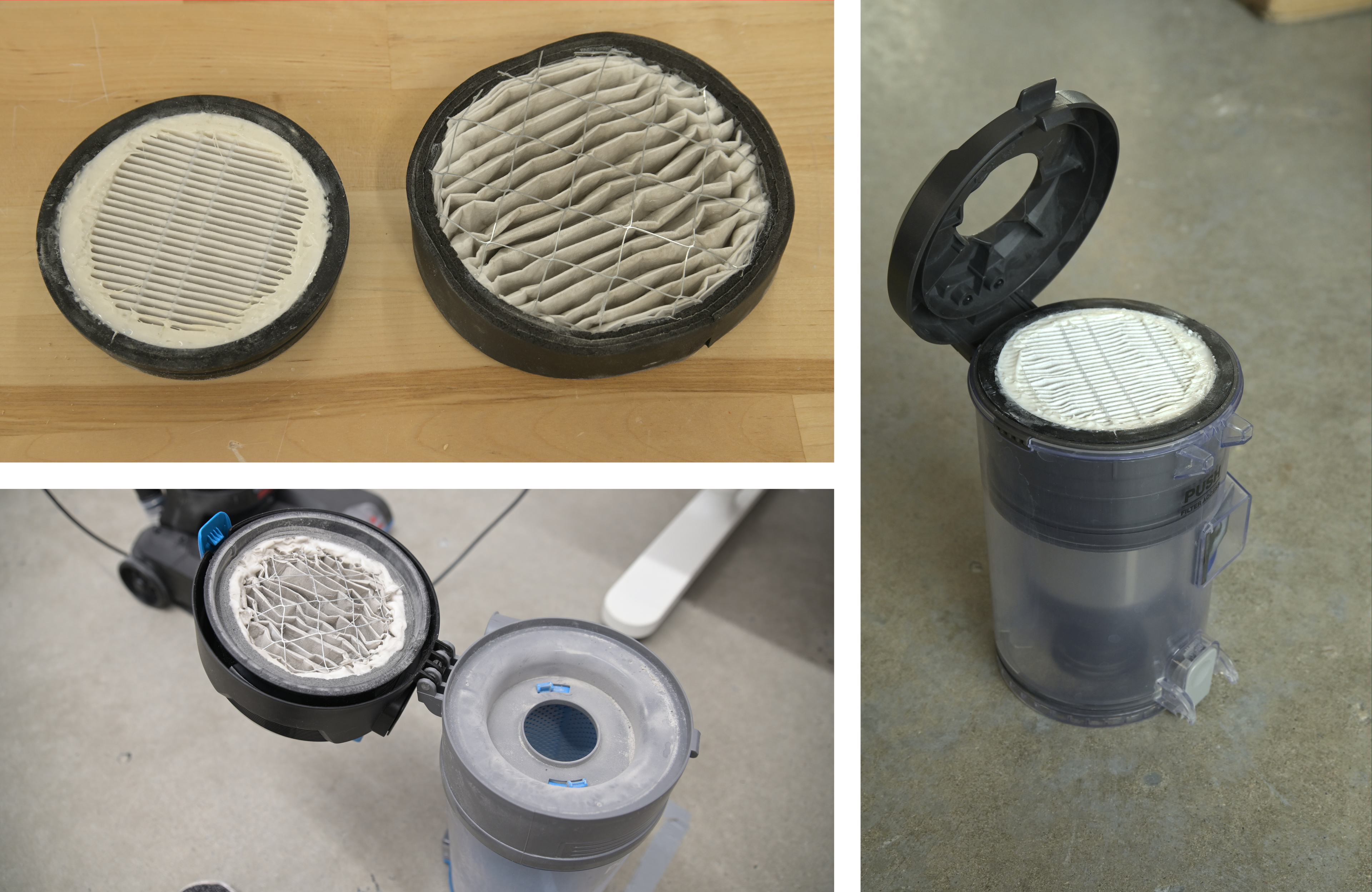 For poorly-performing bagless vacuums, it became immediately apparent that their poor filters were holding them back. They usually had simple foam or cloth post-motor filters, and they could not prevent everything that made it through the cyclone from escaping. We attempted to determine if creating our own filters using readily available materials could be feasible.