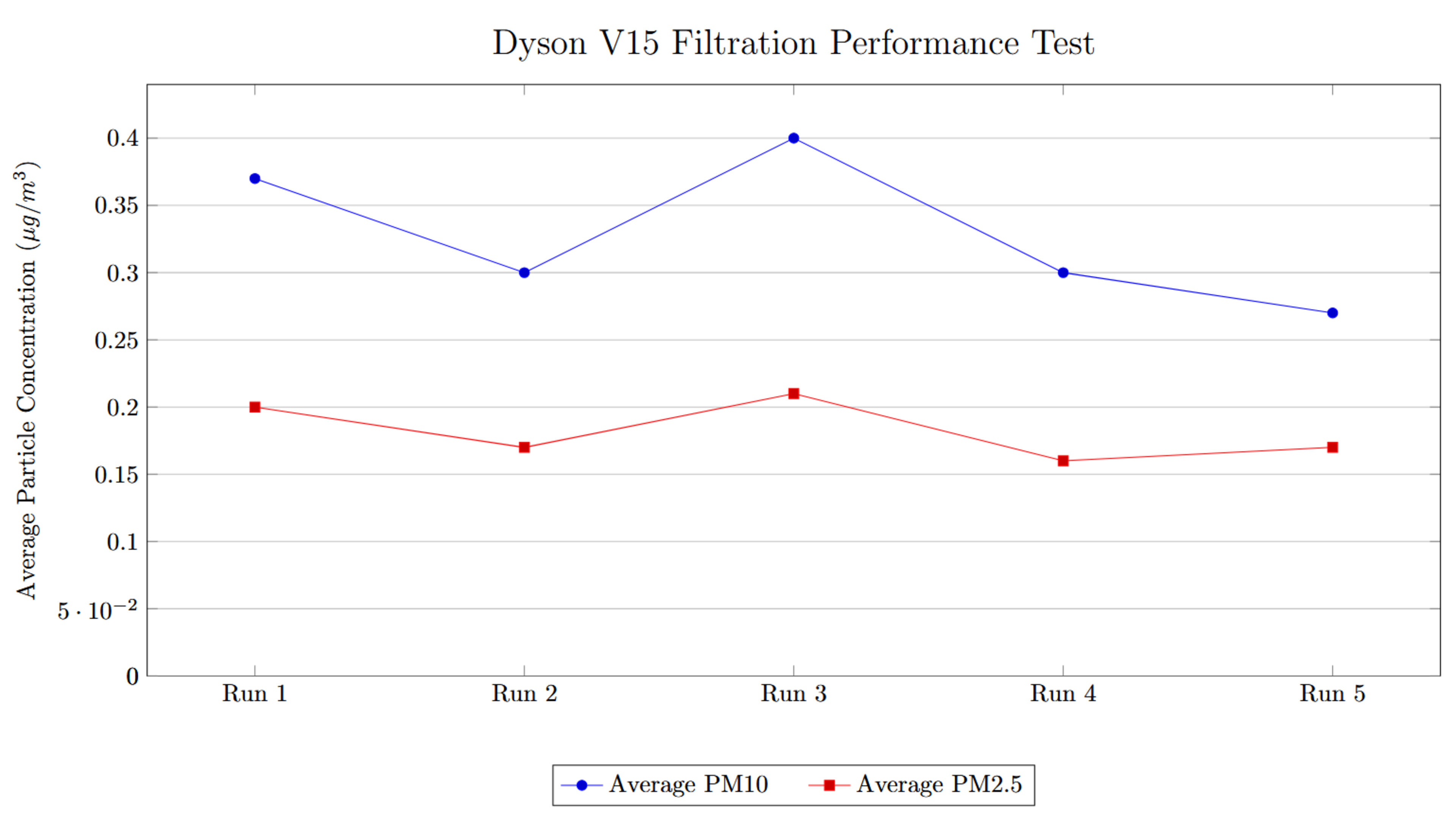 By contrast, bagless vacuums remove particles from the air using a cyclone filter. Therefore, we wanted to know if they improved over time like a bag. We first tested a bagless vacuum as-is, with its post-motor filter installed. Measuring its emissions over five tests, we noticed a slight improvement, but it wasn't very conclusive.