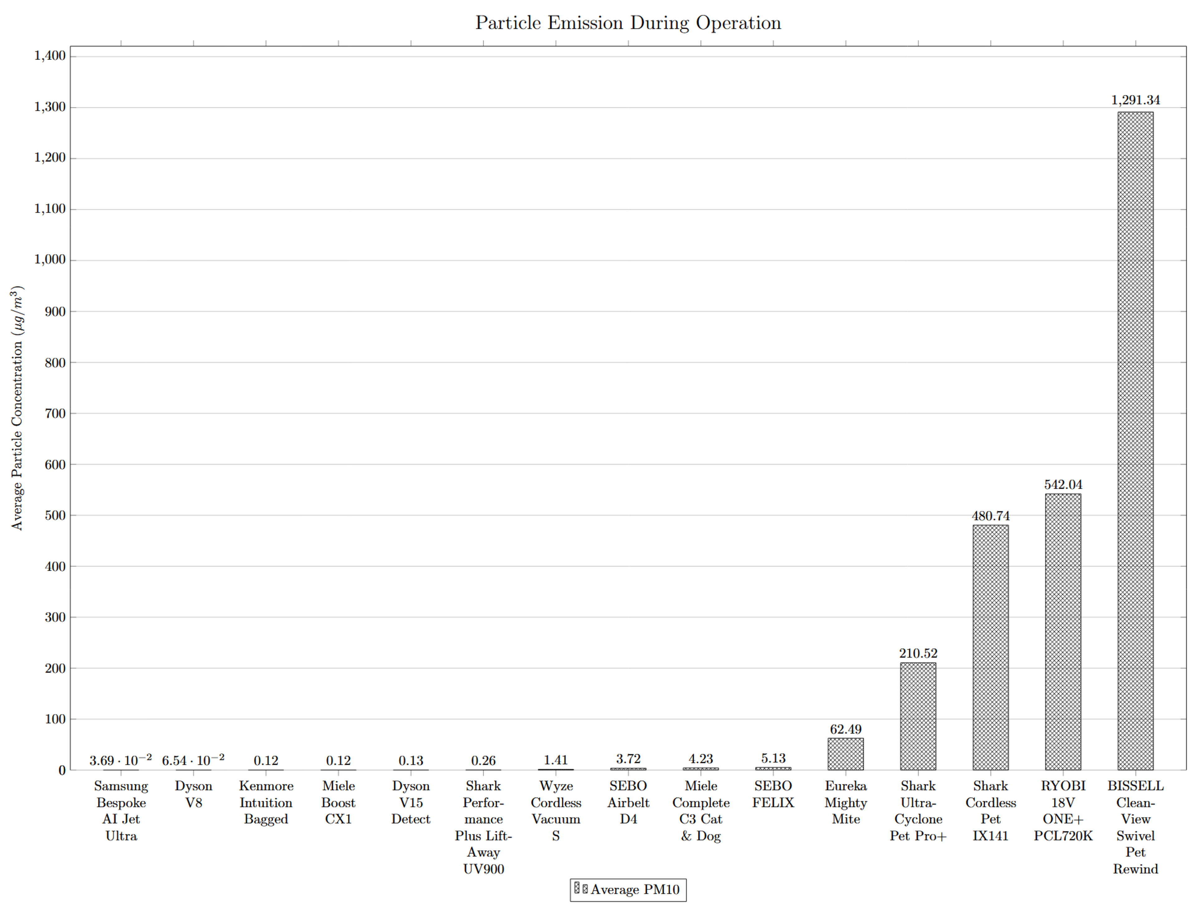 We can observe this trend with other HEPA vacuums we've tested, such as the Kenmore Intuition Bagged or the Shark Performance Plus Lift-Away UV900, both of which had good filtration in our testing. This is in contrast to the RYOBI 18V ONE+ PCL720K and the Eureka Mighty Mite, neither of which has a HEPA filter, and both of which have significant particle emissions.