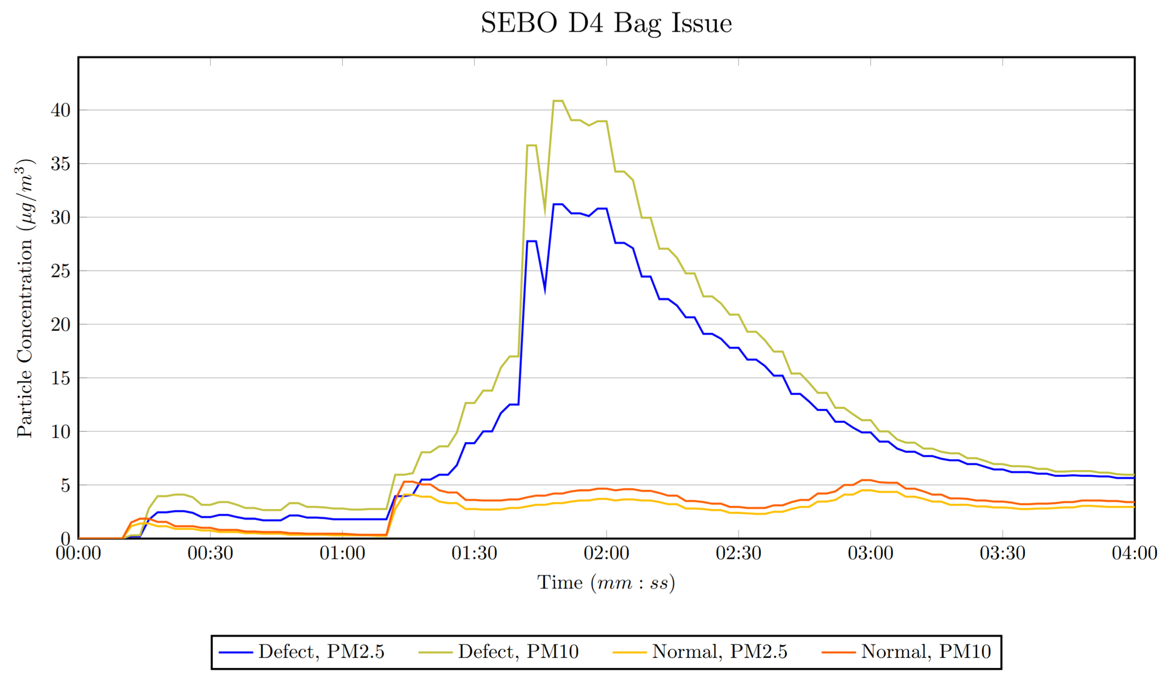 The potential for filter bypass is illustrated with the Miele Boost CX1 above, where we ran it without its filters. It goes from one of the best vacuums we tested to one of the worst. We haven't found egregious examples like this, but we have had instances where we accidentally failed to install the bag properly, allowing some dust to bypass the bag with the Sebo D4. The measurements immediately raised some red flags: