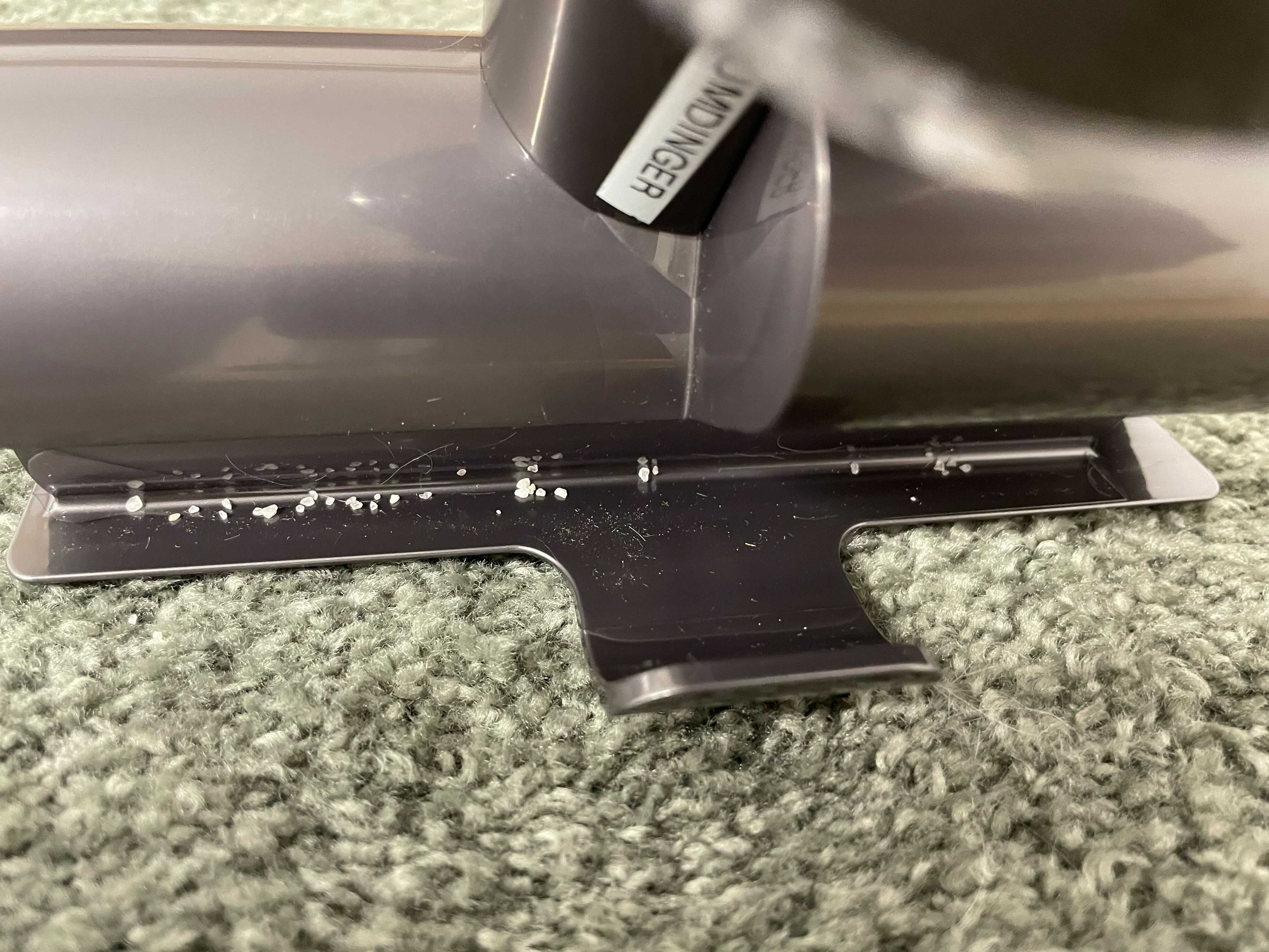 The Dyson Humdinger is decent for spot cleaning high-pile carpets. It cleans fine, medium, and large debris easily but doesn't clean pet hair as well. It's easy to maintain and has no recurring costs, but its dirt compartment is very small, so you need to empty it frequently when cleaning larger messes.