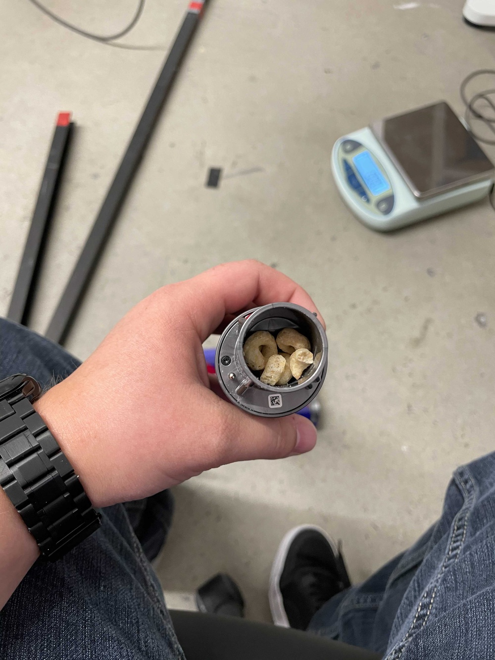 Performance on bare floors is disappointing. It easily picks up smaller debris like rice but struggles with clearing away bulky debris like cereal because it tends to get jammed near the brushrolls, in the wand, or at the narrow entry to the dirt compartment, as seen here.