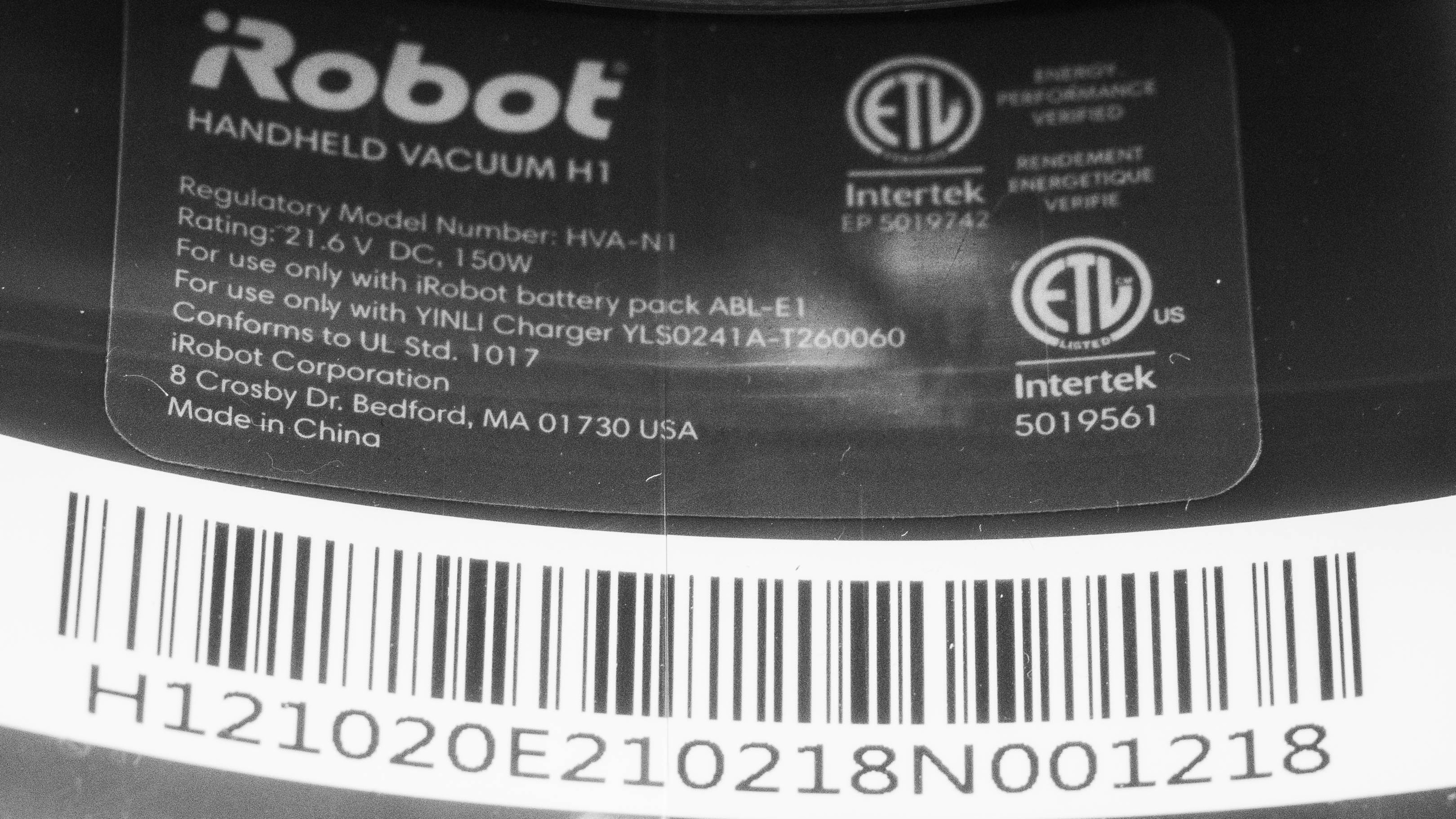 The iRobot H1 is only available in one color variant, Black, and you can see its label here.