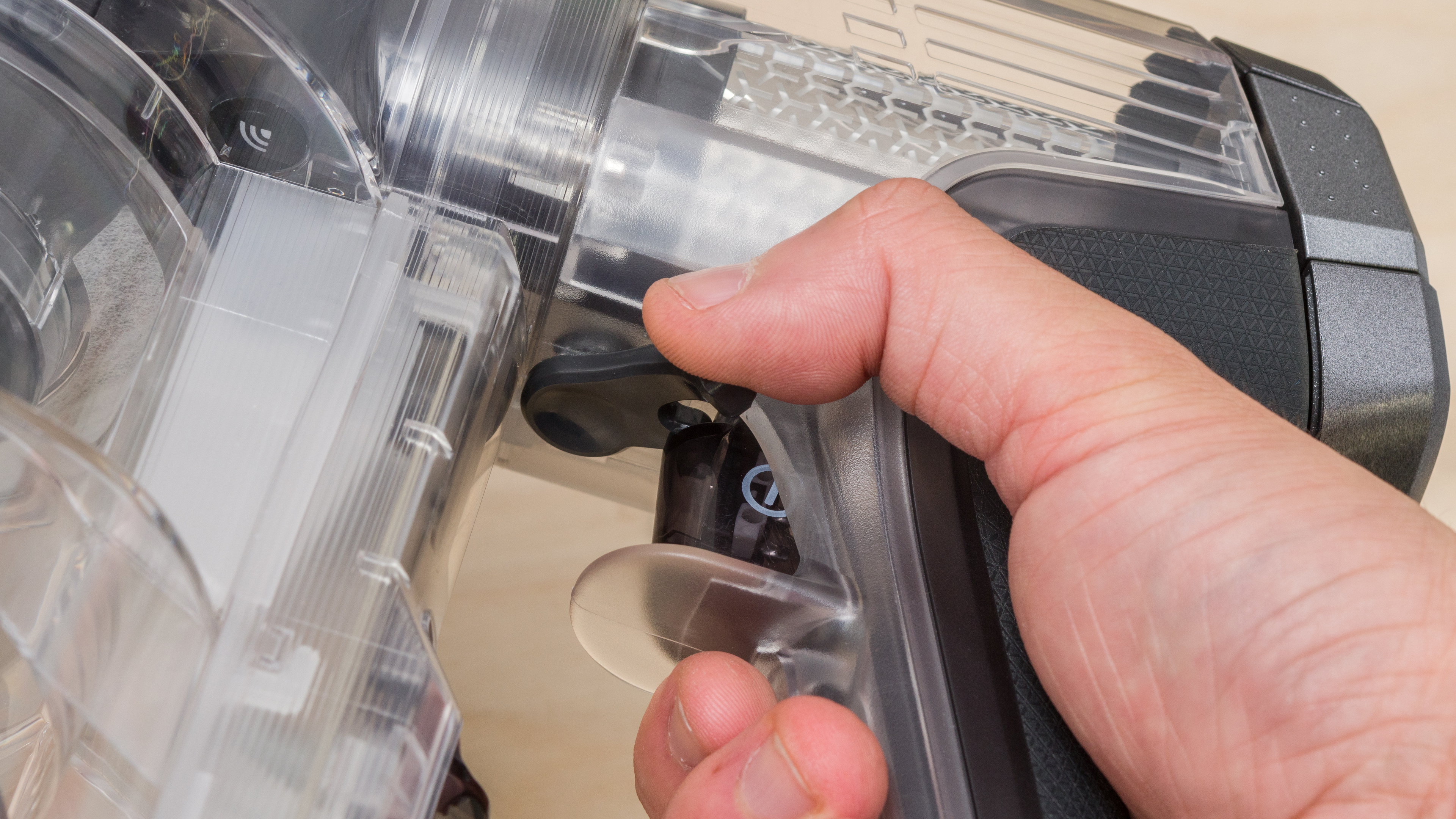 - Dirt Compartment: You can empty the dirt compartment by pressing the release latch at the front of the bin to open its bottom cover and unload its contents over a trash bin. Dust and debris can also get caught on the gasket around the dustbin door, so make sure not to dirty your clothes when opening it up. You can also completely detach it from the main body by pressing the switch under the trigger. It can be wiped out with a damp cloth whenever necessary, but it can be a little tricky to fit your fingers around the center-mounted filter housing. Make sure not to wash the dustbin under running water, as there's a dirt sensor on the inside. If the sensor does come in contact with water, the manufacturer advises drying it out with a hair dryer.