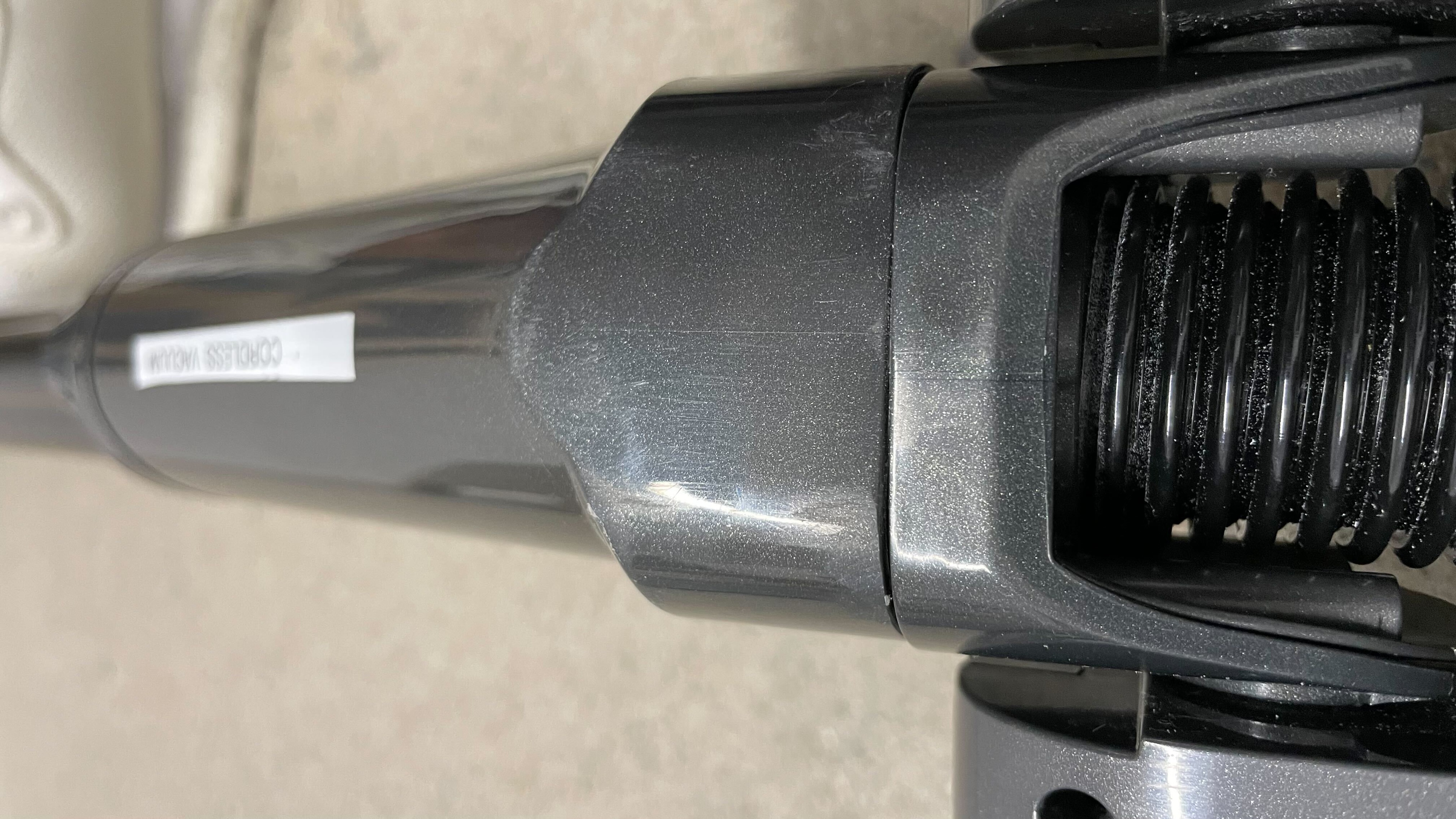 Build quality is passable. The vacuum is mainly made of plastic, though its detachable wand is aluminum, and the floorhead wheels are rubber. It has an LED screen that displays the percentage of remaining battery charge and the current suction power mode. There are a couple of more notable weak points. The back of its floorhead scratches easily, which you can observe on our test unit. Also, while the clear plastic dirt compartment isn't too fragile, it could still break if you drop it.