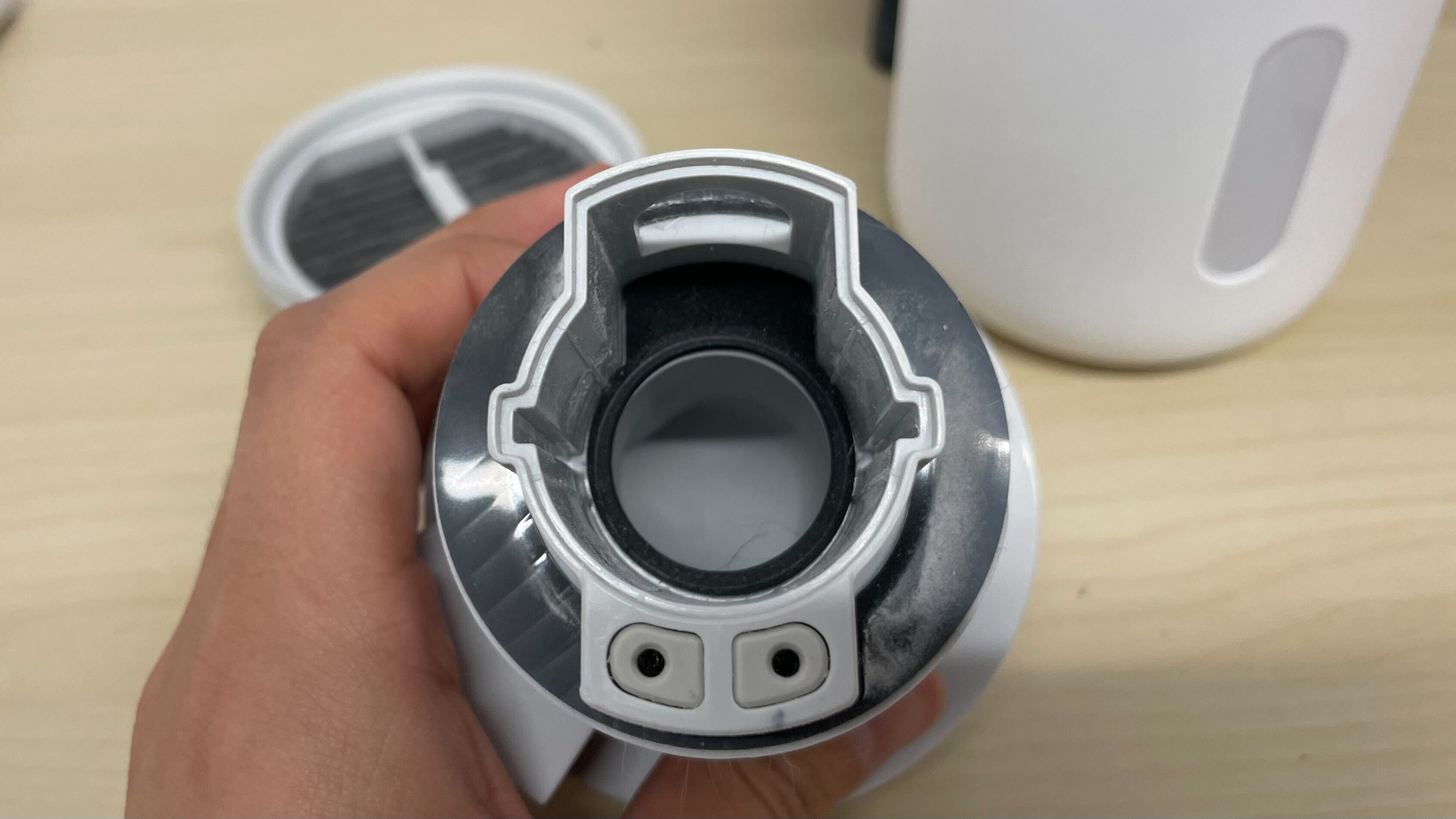 - Cyclone: You can remove this component after detaching the dirt compartment and then pulling the cyclone from its housing. From there, you can separate it very easily into its two component pieces, with the inner cotton filter being inside the cyclone. You should wash the assembly once a week. When inserting the cyclone assembly back into the dustbin, you need to make sure that it's aligned correctly, as this component has the unusual design feature of incorporating a pair of pins that connect to the vacuum's wand. If it isn't placed precisely, you can't connect the wand to the vacuum.