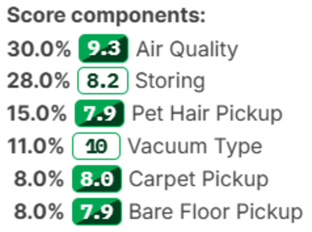 We revised the score components for this usage, incorporating our new consolidated Carpet Pickup usage, which now carries a higher weight in the scoring. We place the greatest emphasis on Portability because it's the most important factor in cleaning a car. For some vacuum types, like upright vacuums, we don't assign a score at all because they aren't suitable for cleaning your car.