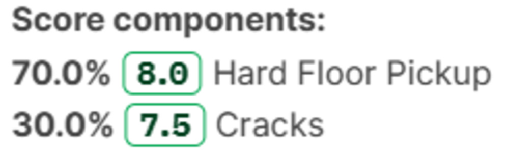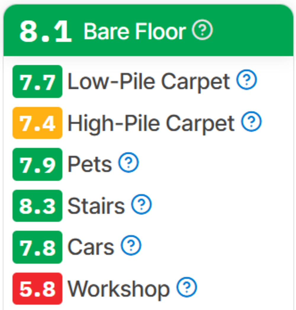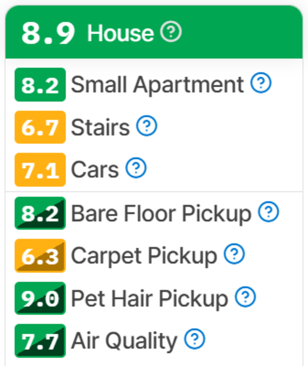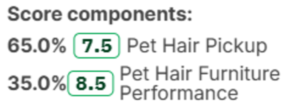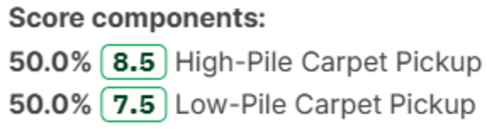 This is another new, simple usage that incorporates the test scores on the two types of carpet we test with the High-Pile Carpet Pickup test and the Low-Pile Carpet Pickup test. This score shows how a vacuum would perform on these typical carpet types.