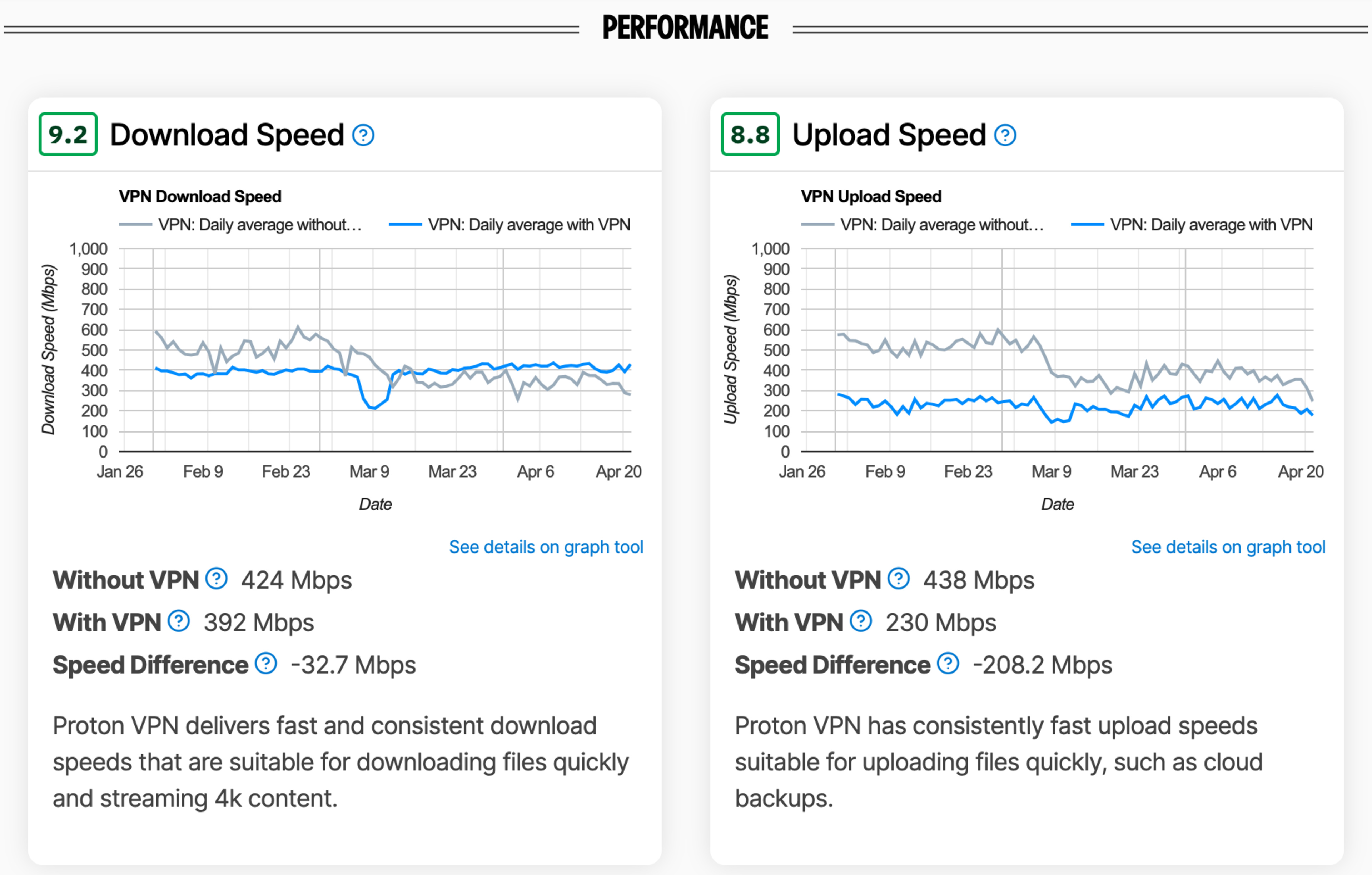 Our test results are updated regularly since our performance tests (speed and latency) are ongoing. If there are any trends or scores that change significantly, we also update the text in the affected reviews so that you have an up-to-date picture of how consistently each VPN performs over time.