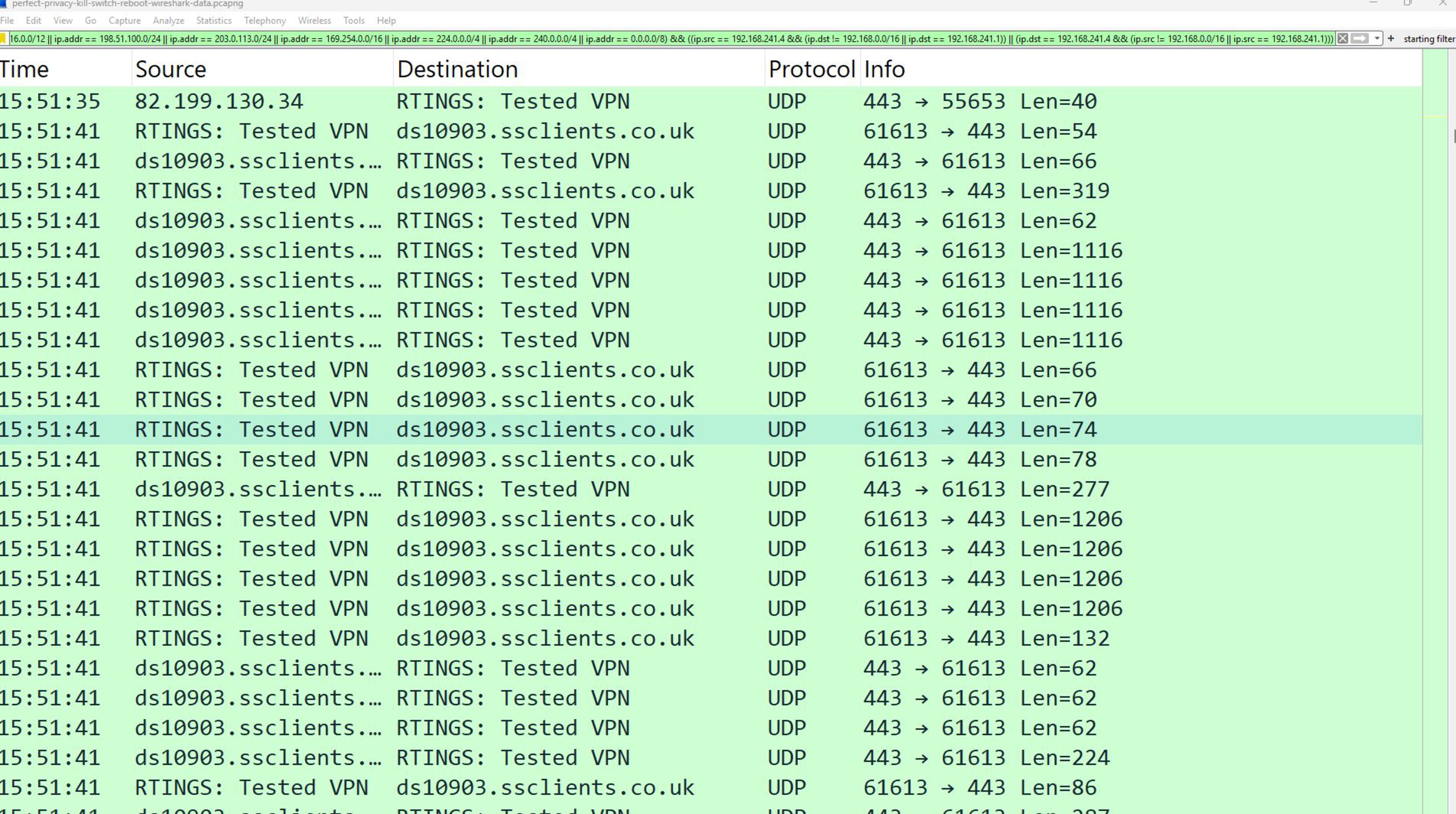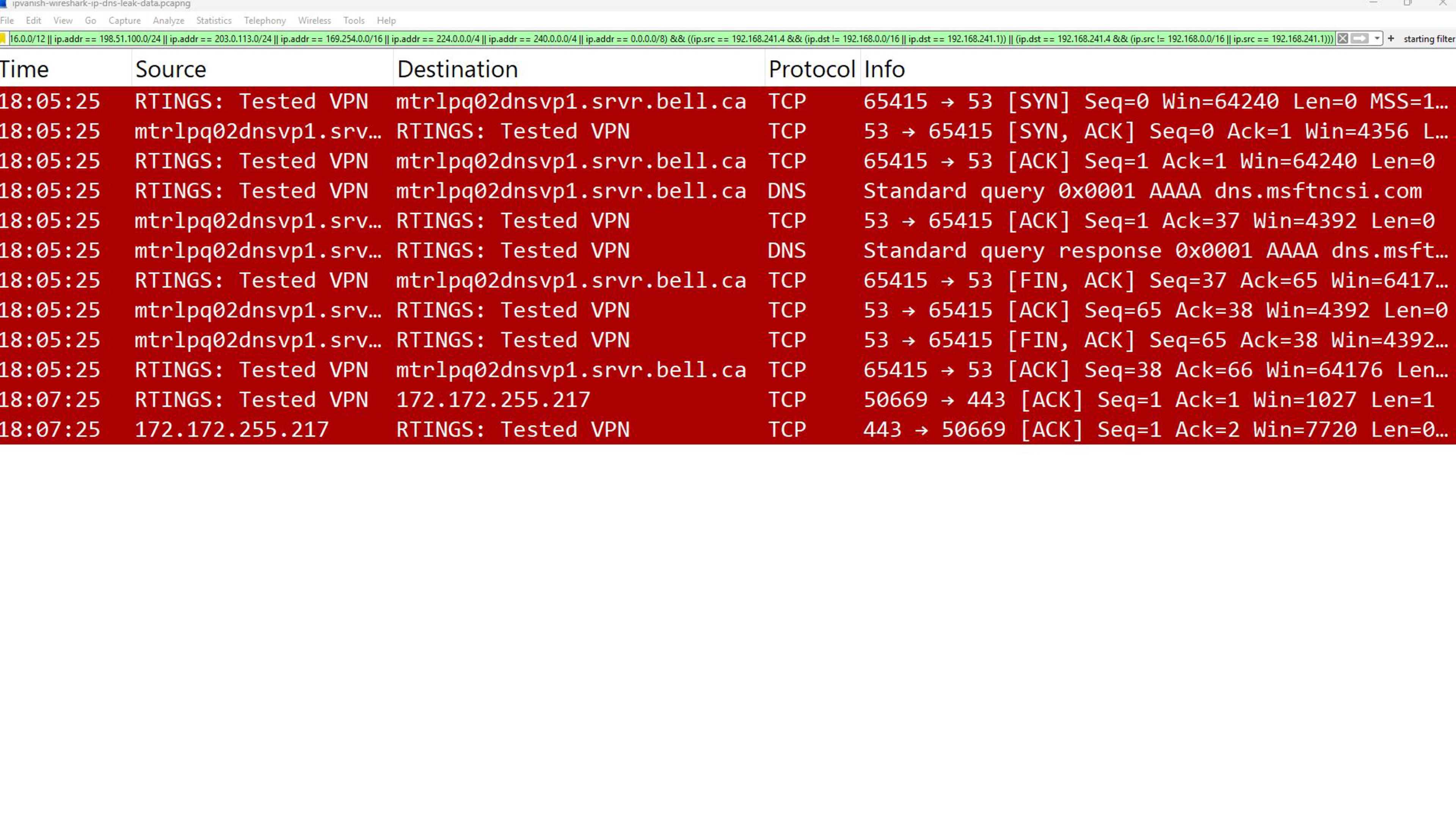 Next, we get to the meat of our security testing, where we see if a VPN really performs as advertised. One of the main reasons you might use a VPN is to mask your true IP address and DNS queries, which interested parties, like your ISP or potentially bad actors, can use to identify you. We test for leaks when the VPN is running normally using IPLeak.net's API and monitor system traffic with another computer running Wireshark.