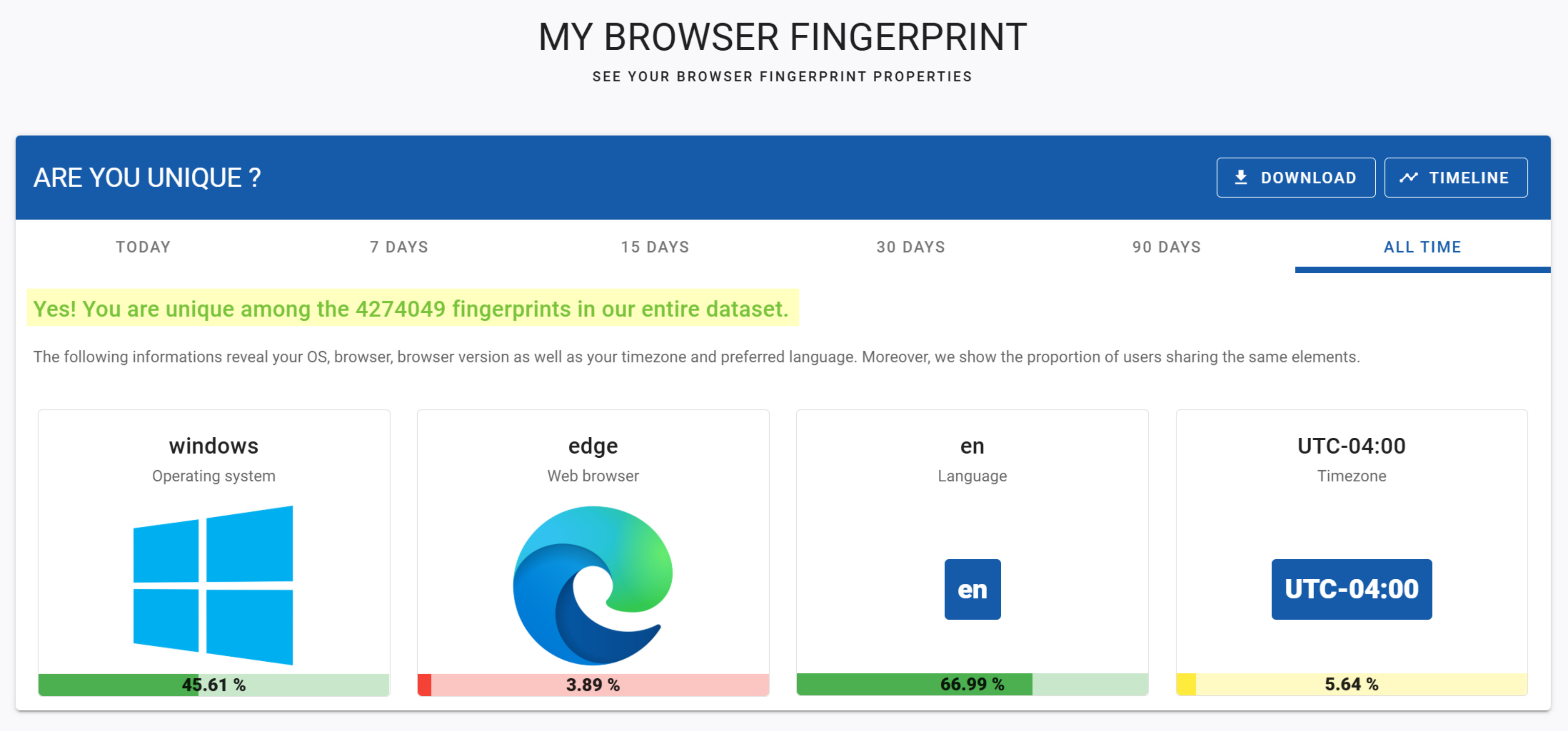 When we first checked our results on amiunique.org, the site reported that every one of our colleagues had a unique fingerprint, even compared against the more than 4 million devices in their database. Impressive as that sounds, their definition of “uniqueness” is a little misleading. The hashes they generate include connection-level details such as IP addresses and battery charge state information. Since IP addresses can be easily hidden behind a VPN and battery information is constantly changing, they fall outside the scope of what’s typically considered core browser fingerprinting.