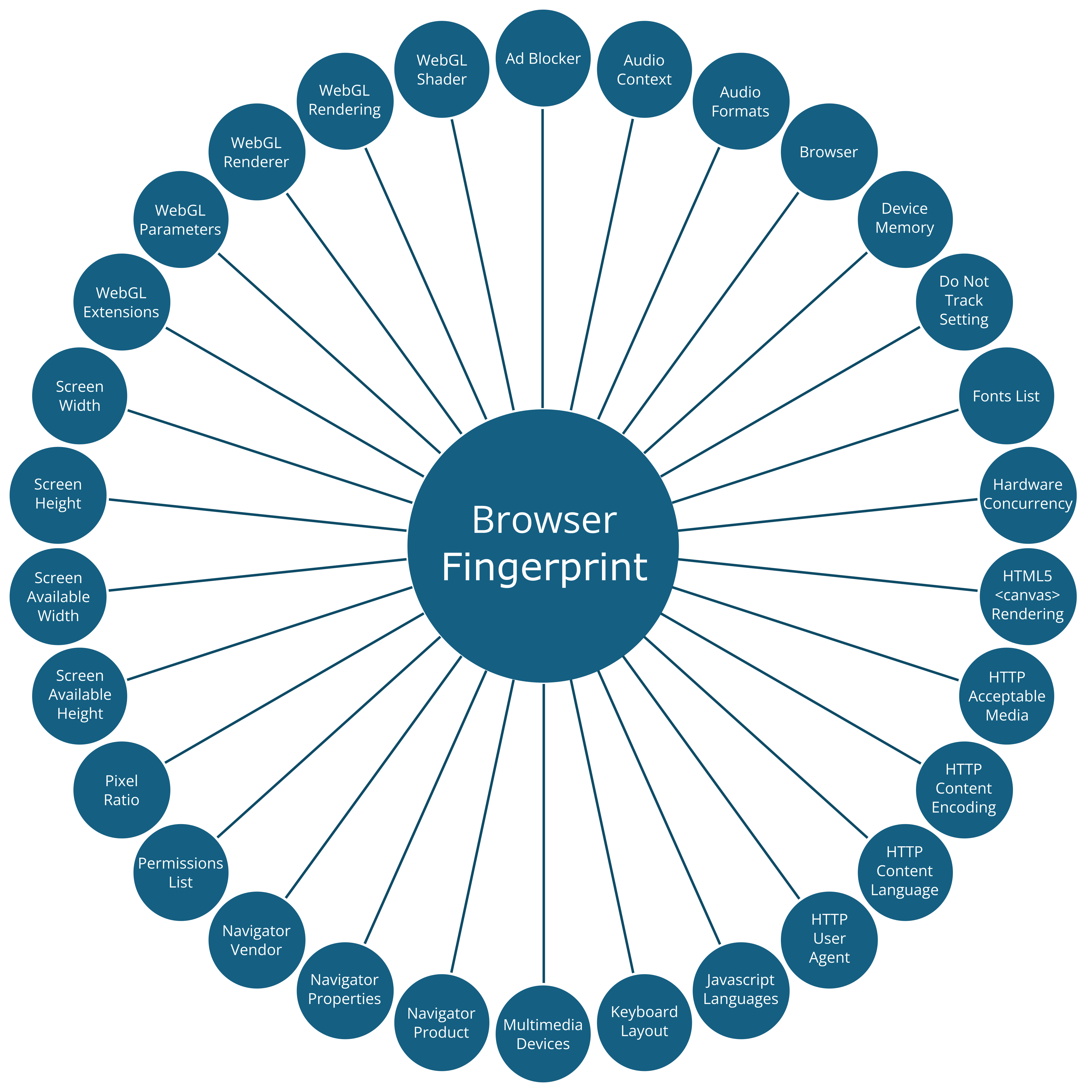 Timezone Canvas Fingerprints Use of Ad Blocker Web Navigator Properties Hardware Concurrency Installed Browser Plugins Browser Permissions Acceptable Media Formats System Sensors System Taskbar Layout |