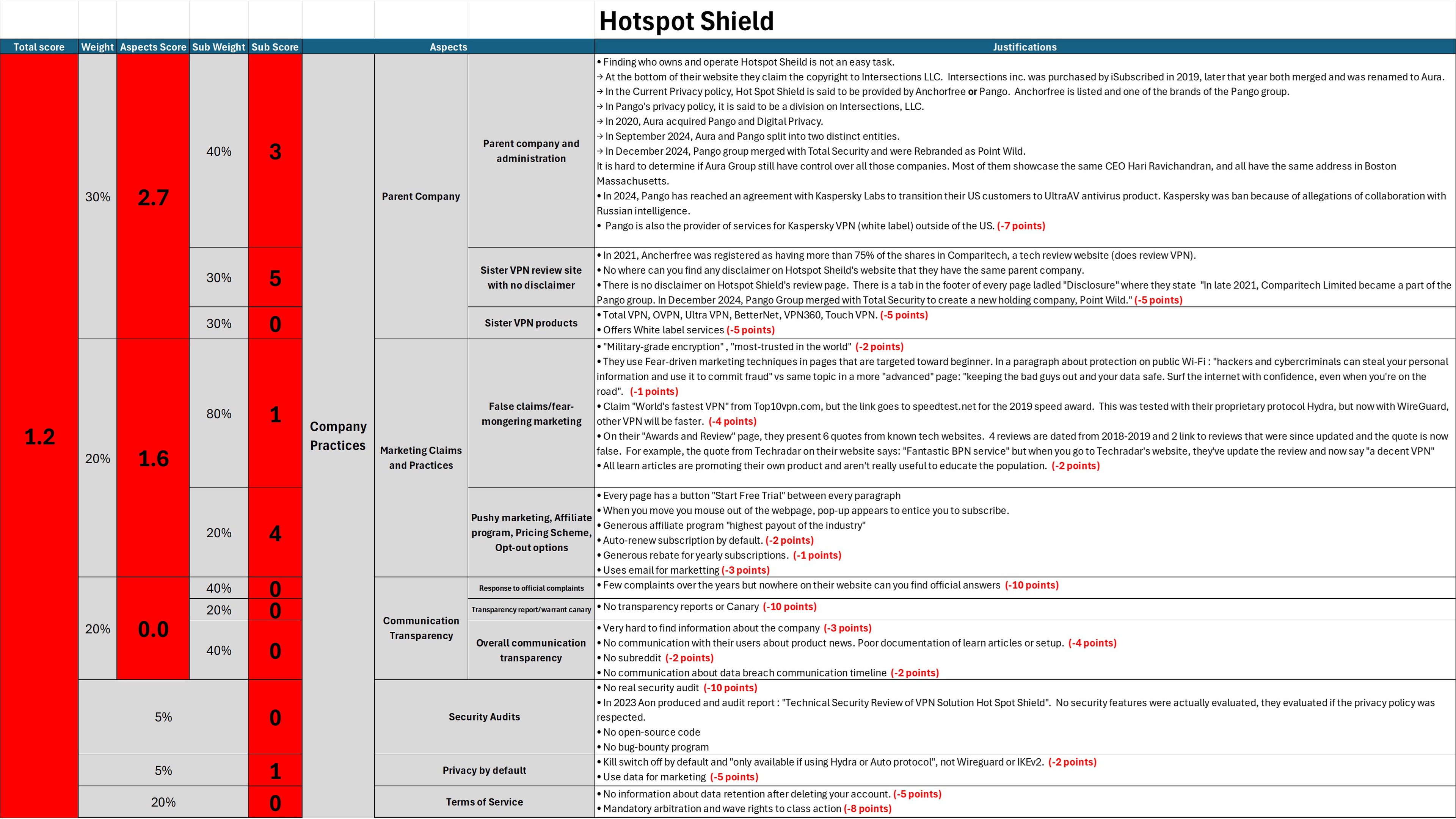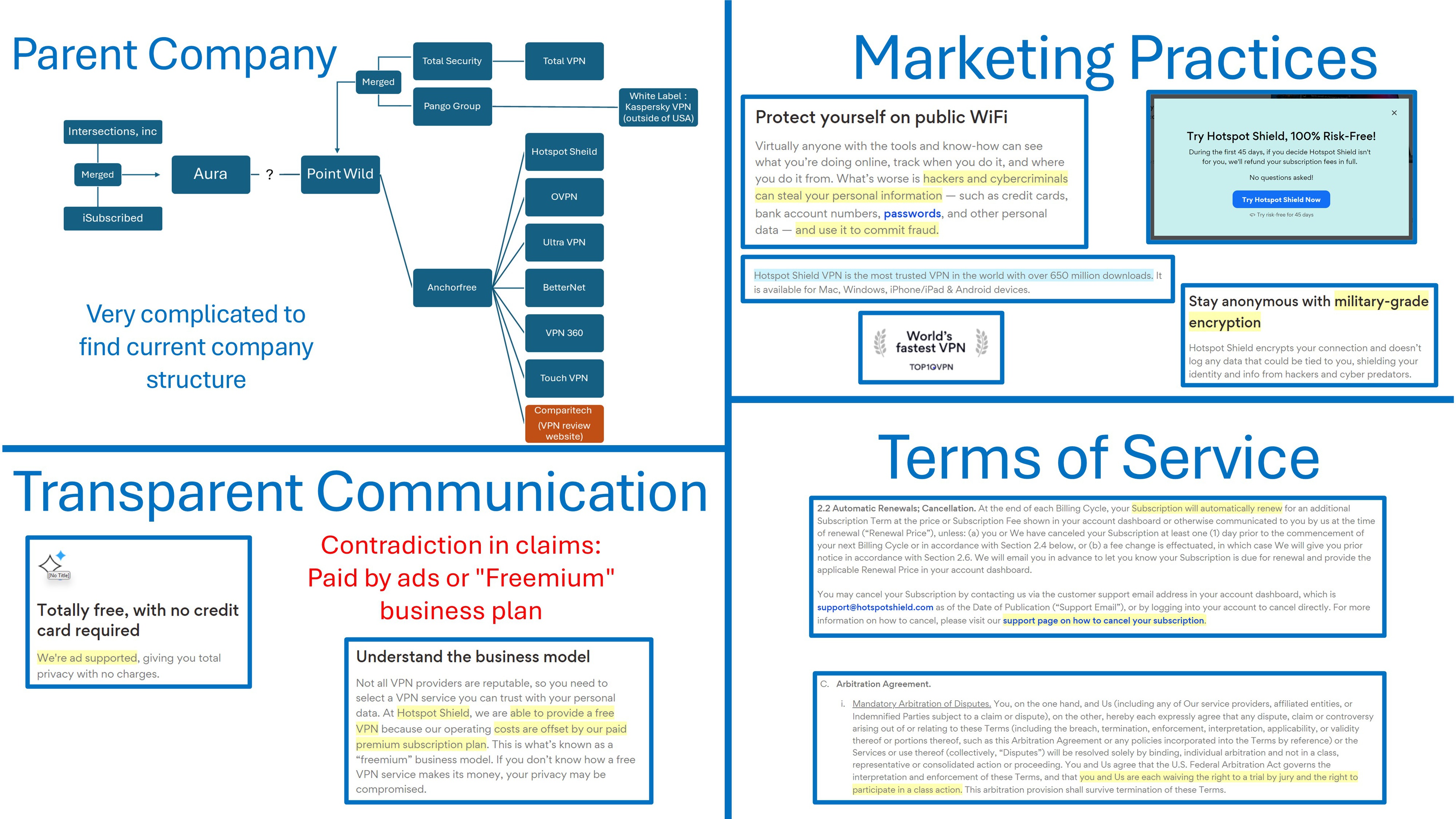 Hotspot Shield's company practices are awful. Their ownership structure is incredibly complicated and opaque. Currently, Hotspot Shield appears to be under the umbrella of Point Wild, which also owns several other VPNs and a VPN review site. Their privacy policies mention various companies associated with Hotspot Shield, many of which have undergone mergers and demergers in recent years.