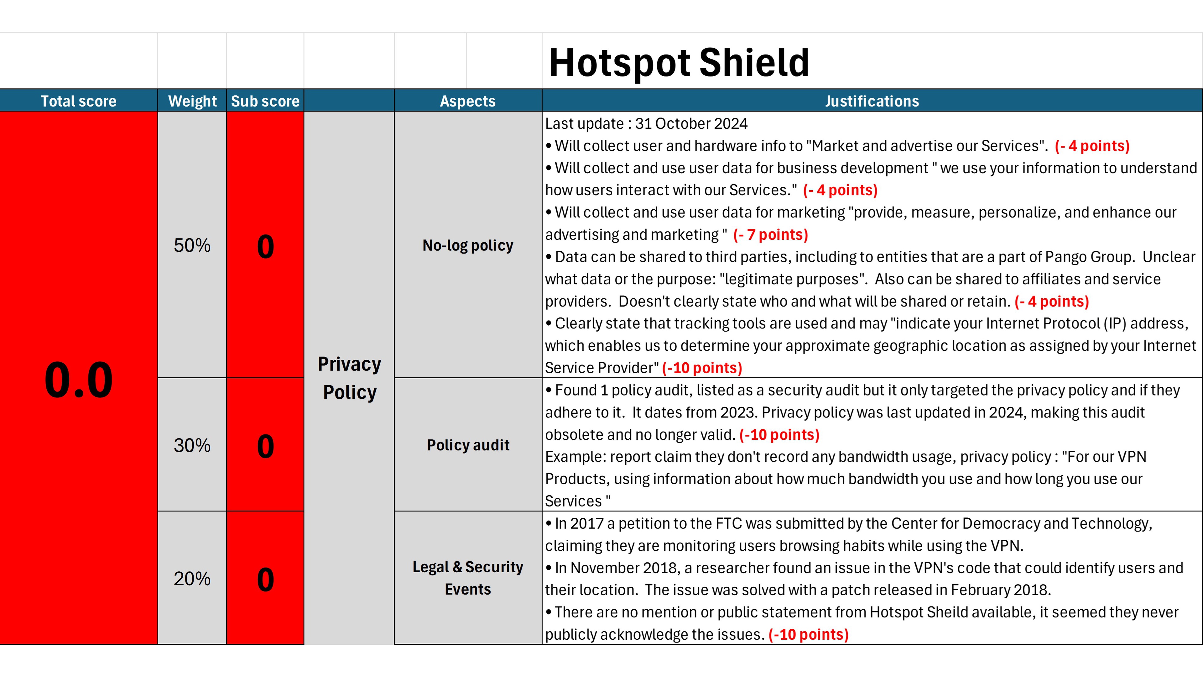 Hotspot Shield's policies and business practices are awful. Its privacy policy explicitly allows the company to collect and retain its users' personal information for marketing and share it with third parties for targeted advertising and tracking. Additionally, the company has a history of security vulnerabilities and incidents that it hasn't fully acknowledged or addressed. This lack of transparency is also shown by its convoluted corporate ownership structure and the absence of up-to-date third-party audits of its privacy policy and security infrastructure.