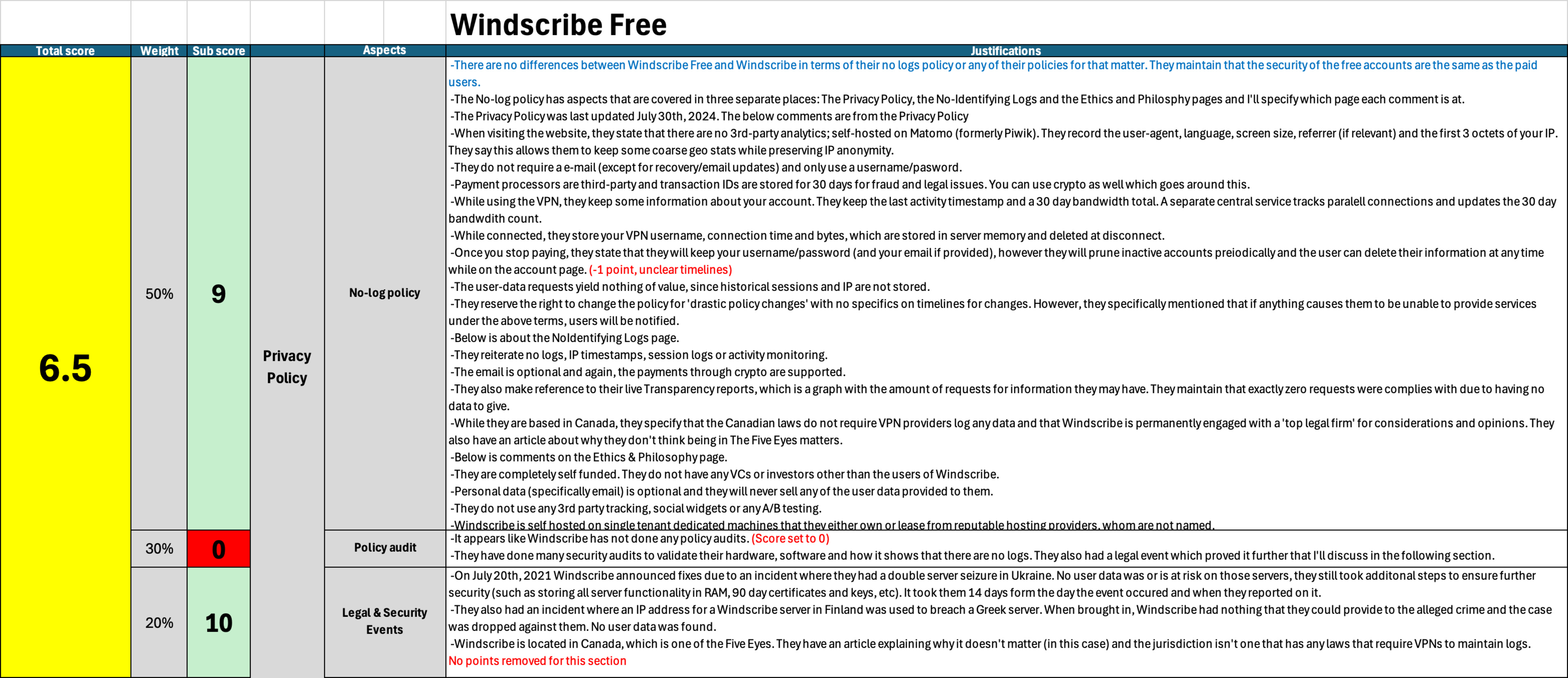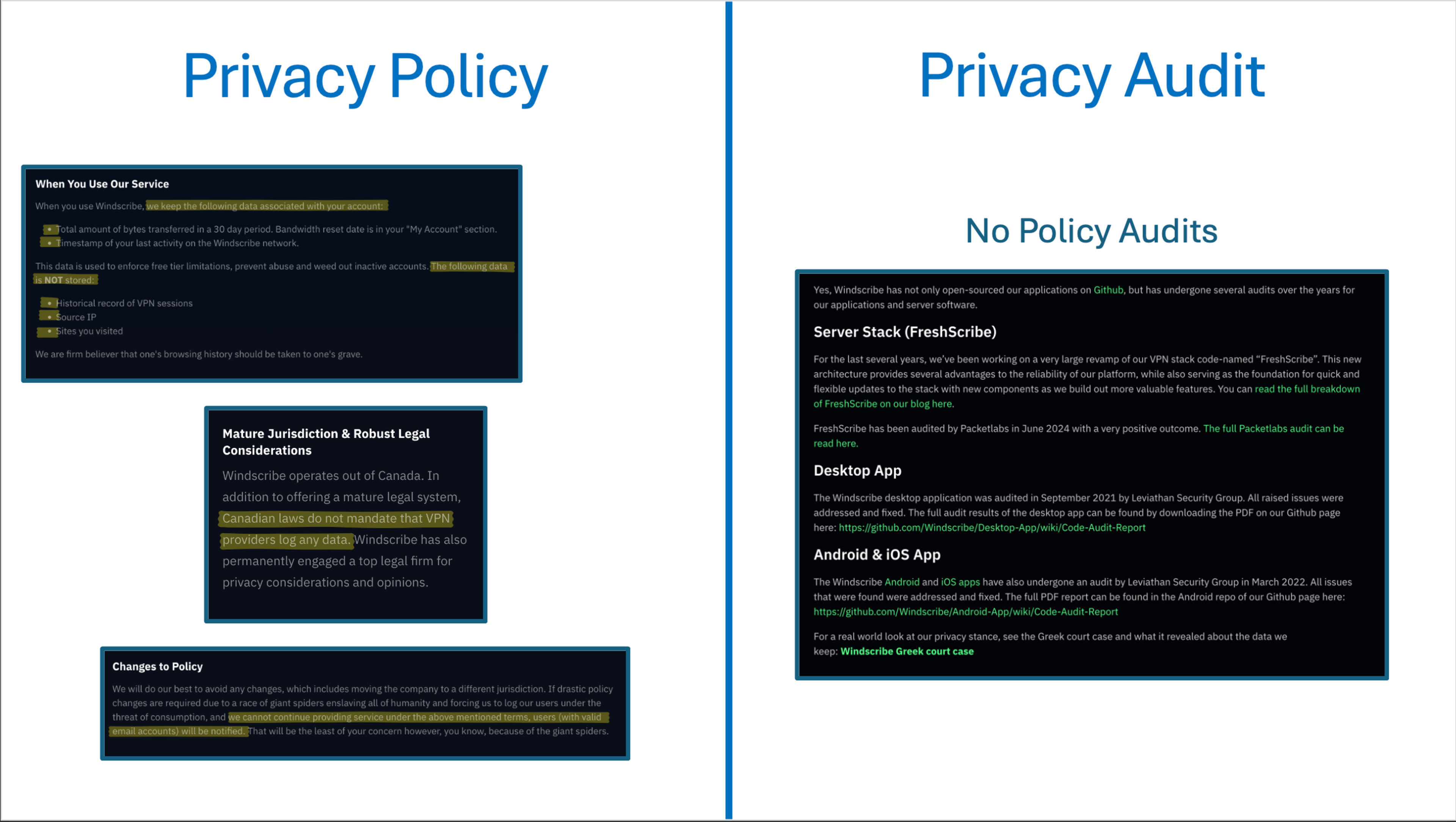 Windscribe Free has very good policies and business practices. The privacy and no-logs policies are easy to understand and explicitly state that no data is retained, a fact that has been proven by their inability to produce user traffic in court in the past. The company is transparent about its ownership, and the staff maintain an active presence in the community. That said, while publishing third-party audits of their security infrastructure, they've never published an audit of their privacy or no-logs policies.