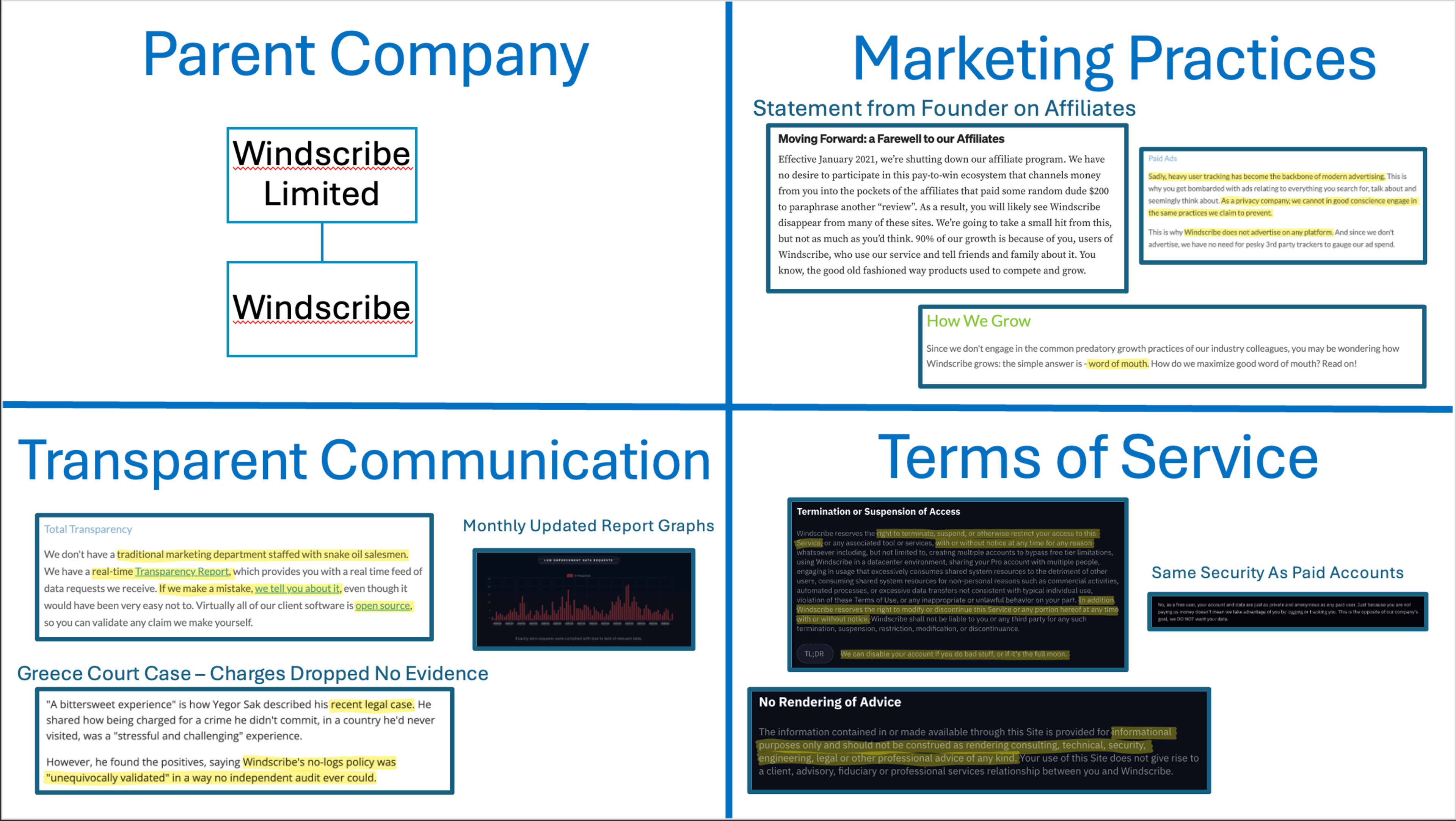 There are some broad statements in the terms of service, and there are statements that give Windscribe the ability to define misuse and ban accounts at its own discretion. Otherwise, the terms of service are satisfactory.
